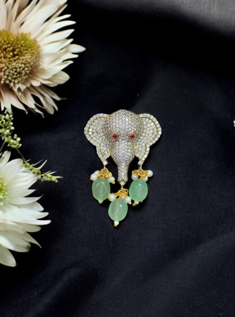 AD Elephant Brooch Pin, crafted with sparkling American Diamond stones and intricate detailing for a regal look. Symbolizing strength and good fortune, this versatile accessory is perfect for sarees, blazers, turbans, or scarves. An elegant blend of tradition and style, ideal for weddings, festive occasions, or adding charm to everyday wear.