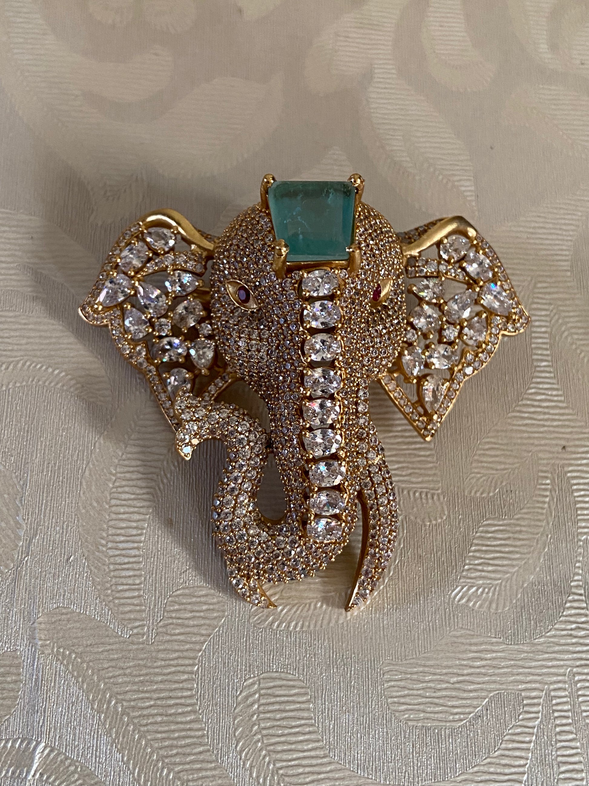 AD Elephant Brooch Pin, crafted with sparkling American Diamond stones and intricate detailing for a regal look. Symbolizing strength and good fortune, this versatile accessory is perfect for sarees, blazers, turbans, or scarves. An elegant blend of tradition and style, ideal for weddings, festive occasions, or adding charm to everyday wear.