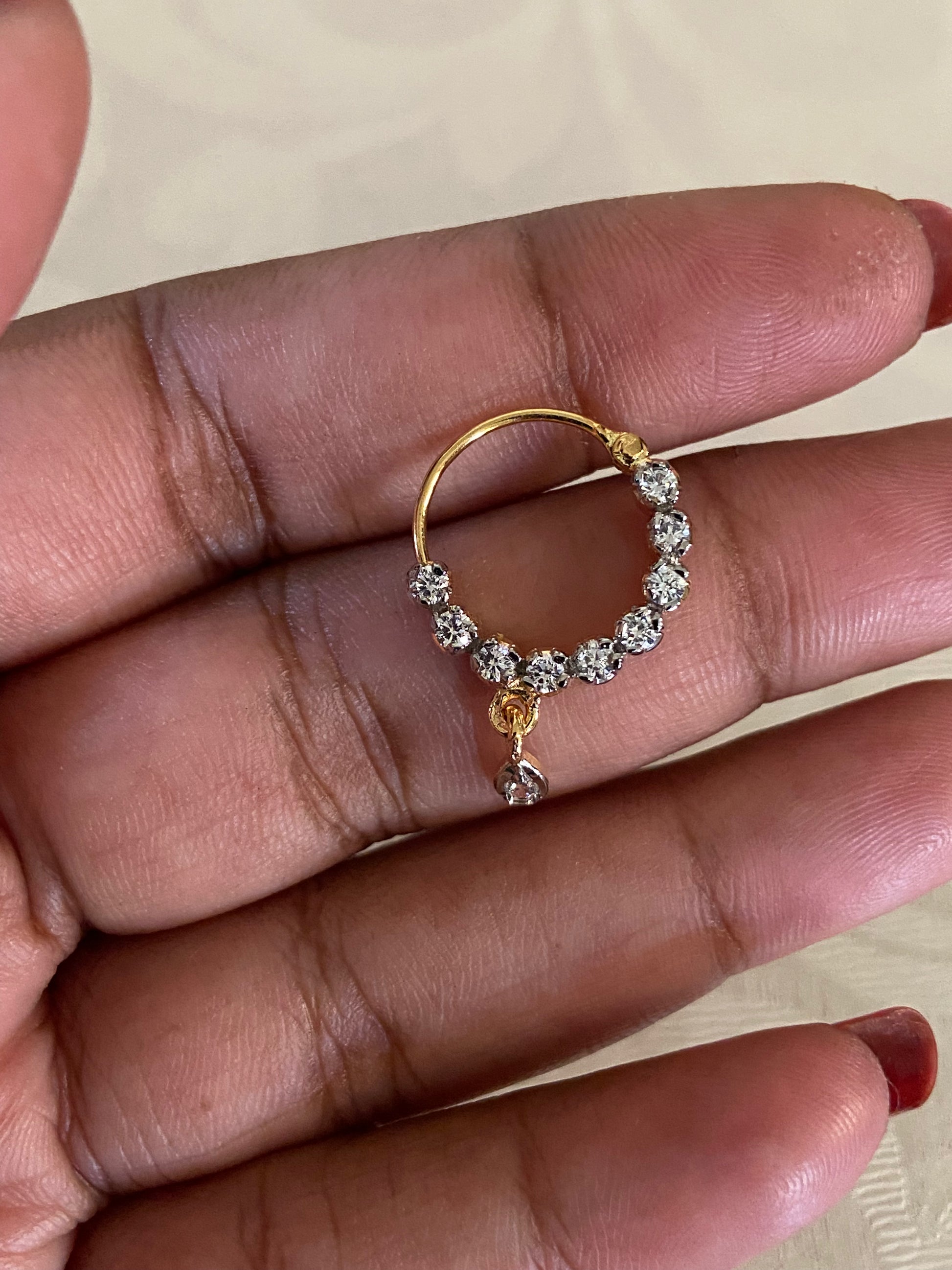 The AD Nose Ring is a delicate accessory adorned with sparkling American Diamond stones. Lightweight and elegant, it adds subtle shine and graceful charm, perfect for everyday wear, festive occasions, and traditional or modern looks.