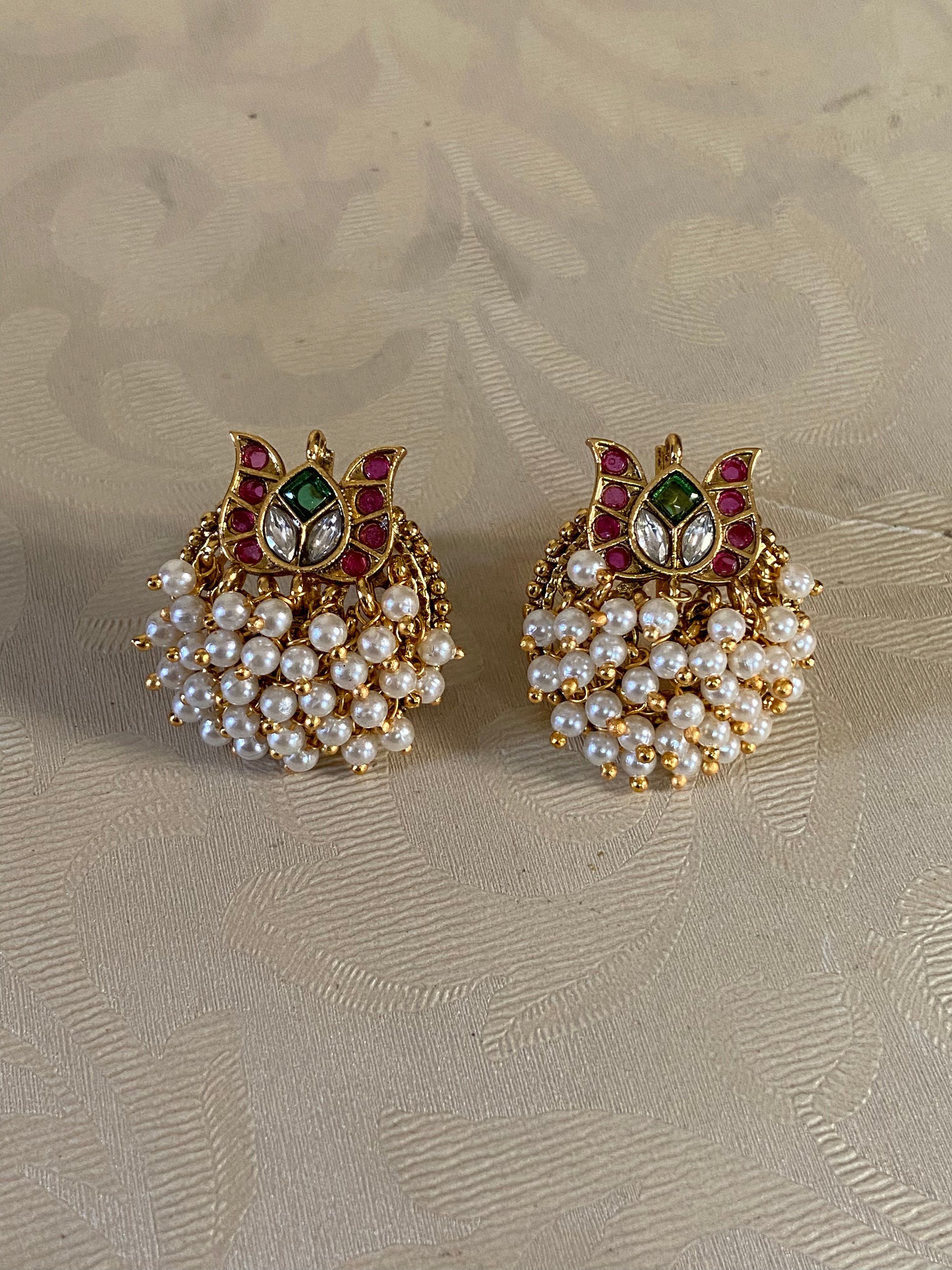 Elegant antique-style tops adorned with rich kemp stones and delicate pearl drops. A perfect traditional accessory for festive and ethnic looks.