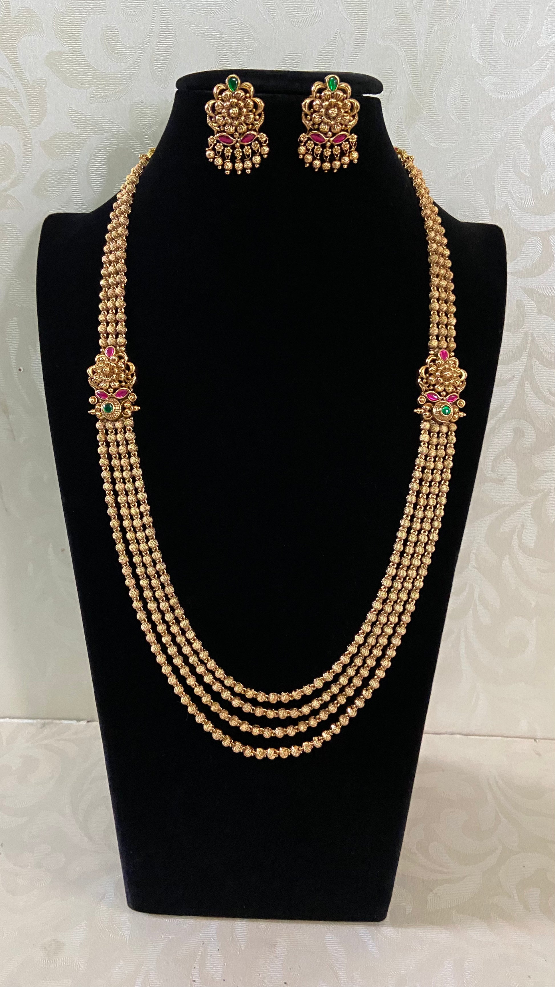 Crafted with traditional artistry, this Antique Nakshi Small Balls Necklace features classic gundla (gold ball) detailing and comes with matching studs. A true symbol of timeless elegance, this Indian Haram is perfect for weddings, festive occasions, and cultural celebrations, adding a graceful heritage touch to your look.