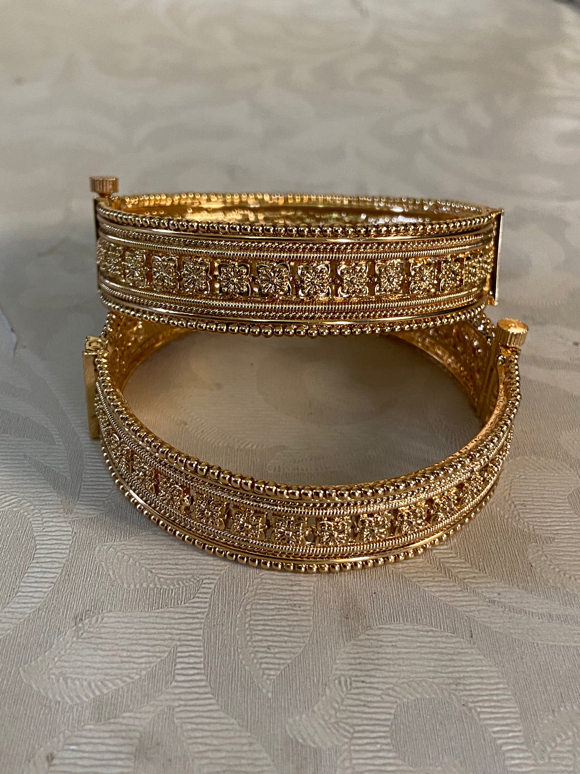 Antique Openable Bangles 2 peace Set feature timeless traditional design with a rich antique finish that reflects classic Indian craftsmanship. Crafted for both beauty and comfort, the openable style makes them easy to wear while ensuring a secure fit. Ideal for weddings, festivals, and special occasions, these bangles pair effortlessly with sarees and ethnic outfits, adding a touch of royal elegance and heritage charm to your jewelry collection.