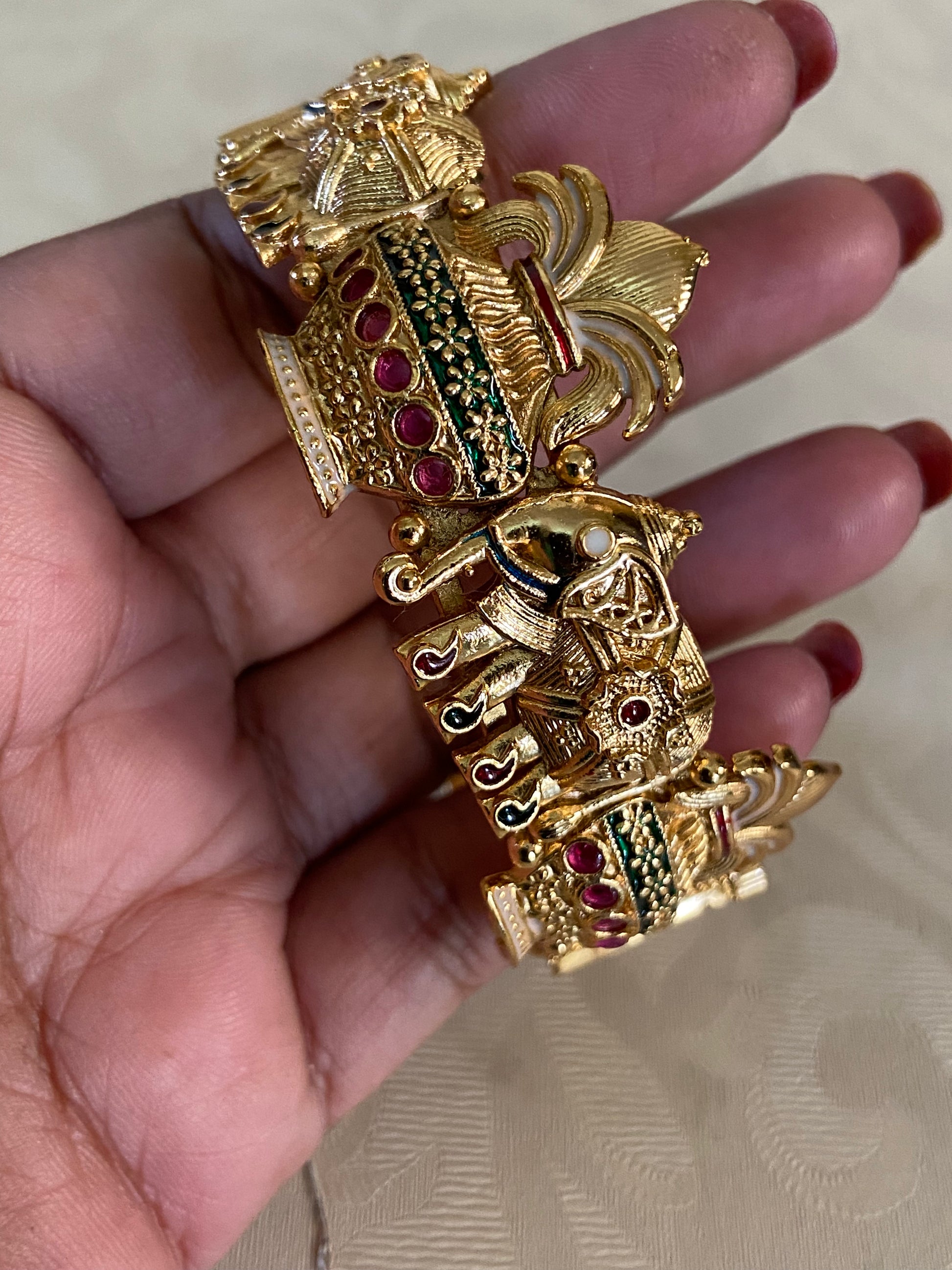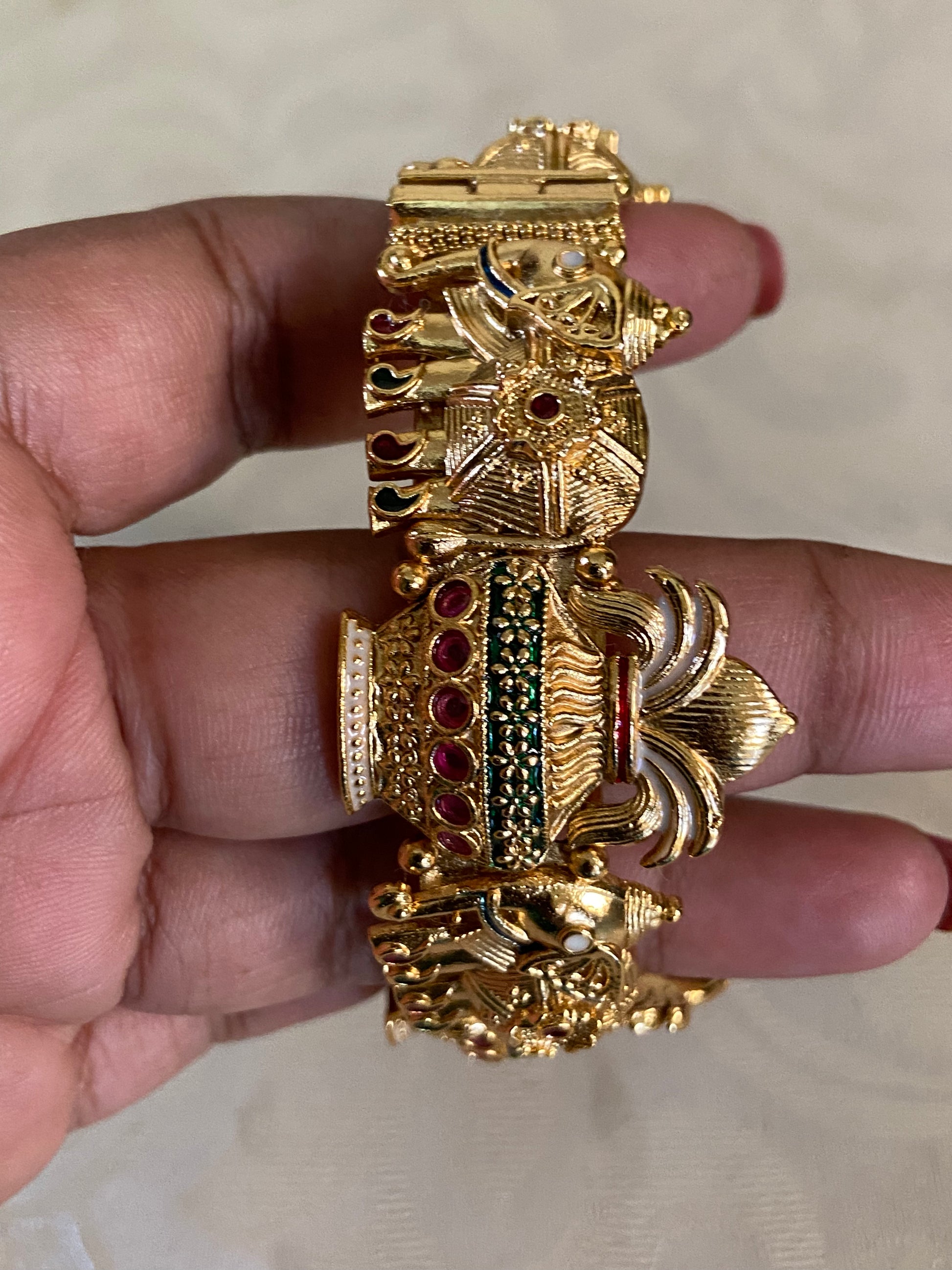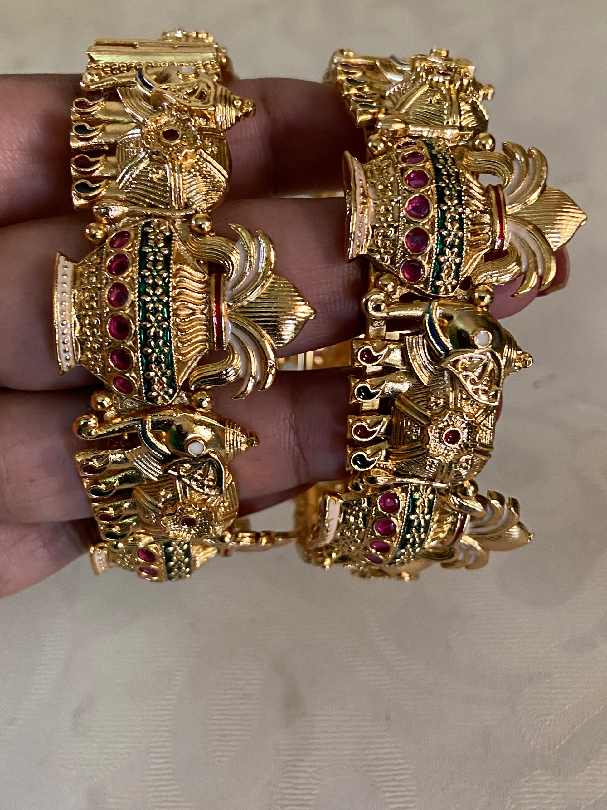 These antique openable kadas 2 peace Set beautifully feature kalisam elephant motifs, symbolizing strength, wisdom, and prosperity. Crafted with intricate temple-style detailing, the design is enhanced with floral patterns and subtle ruby and green stone accents. The rich gold-tone finish and traditional artistry give a regal appeal. Ideal for weddings, festivals, and classical attire, these kadas add timeless elegance and heritage charm to any jewelry collection.