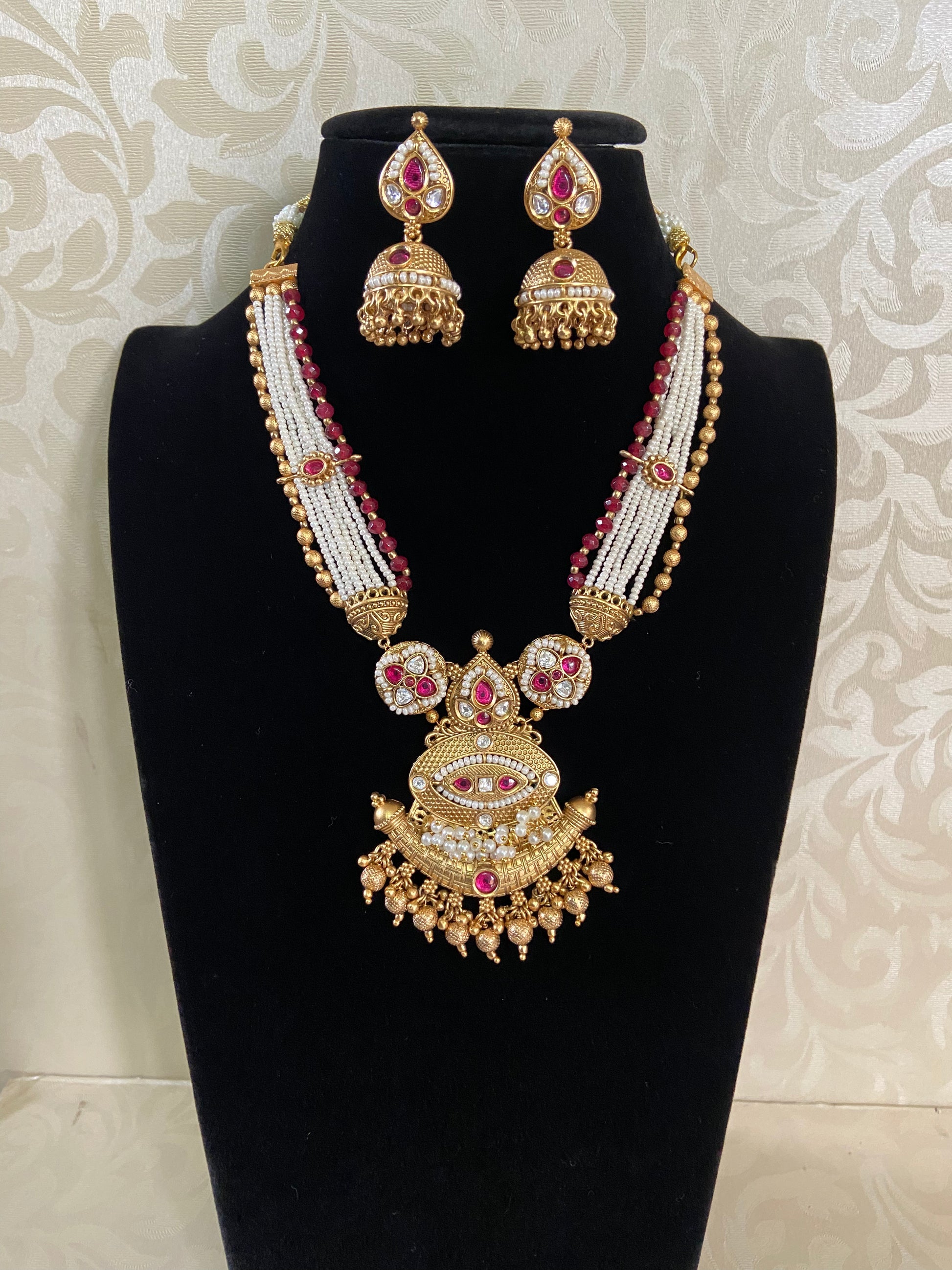 Embrace timeless beauty with this Antique Pearl & Kundan Necklace with Jumki Earrings, a perfect blend of traditional elegance and royal charm. The necklace features exquisite Kundan craftsmanship adorned with radiant pearls, creating a rich and graceful look that complements any festive or bridal ensemble.Paired with matching Jumki earrings, this set adds a touch of heritage sophistication and grandeur. Ideal for weddings, traditional functions, and special occasions, it beautifully enhances sarees, lehengas, and other ethnic outfits with its classic antique finish.