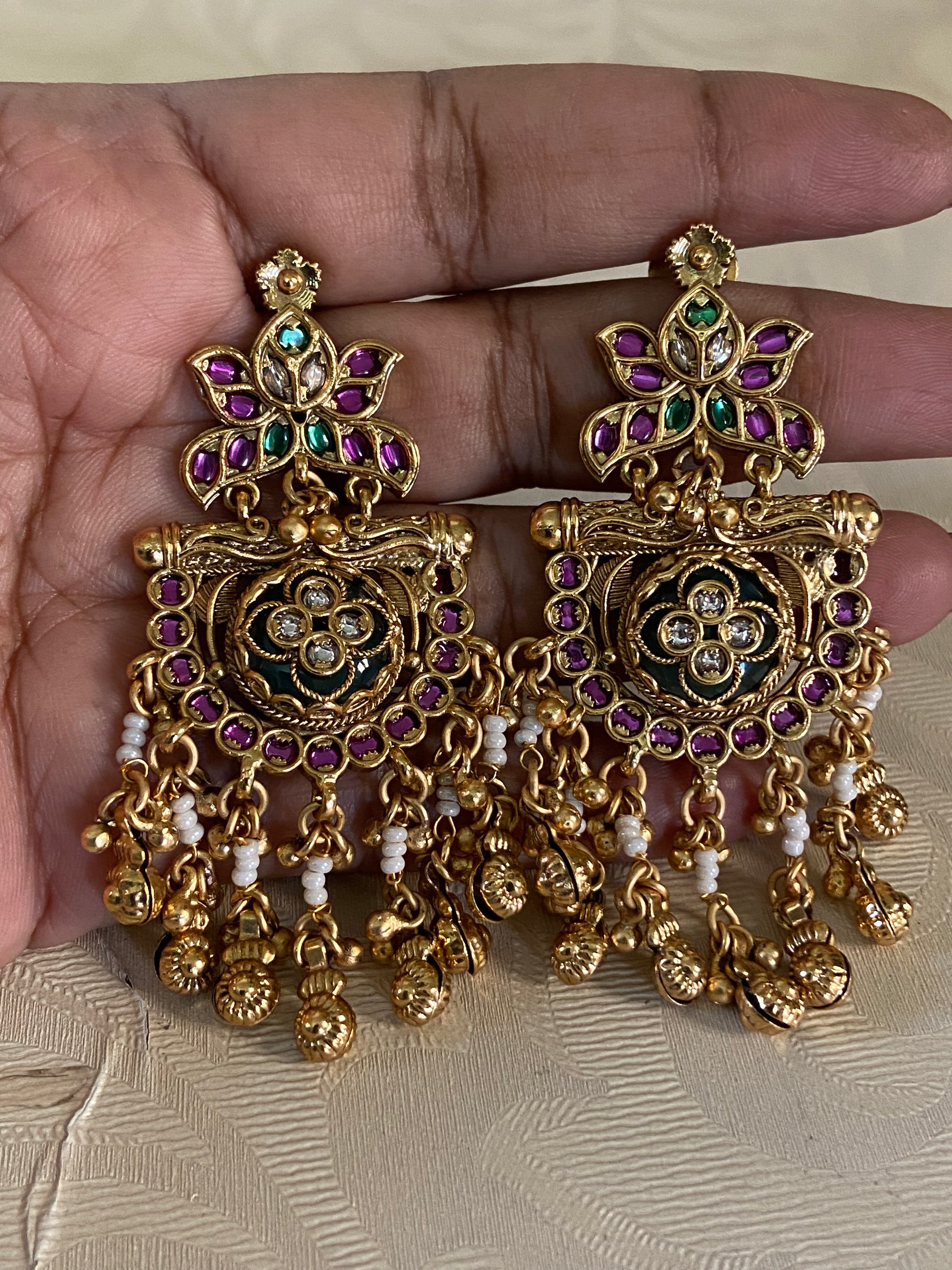 Antique ruby earrings crafted in a timeless traditional design with a rich antique finish. The deep red ruby stones add regal elegance, making them perfect for festive occasions, weddings, and classic ethnic wear.