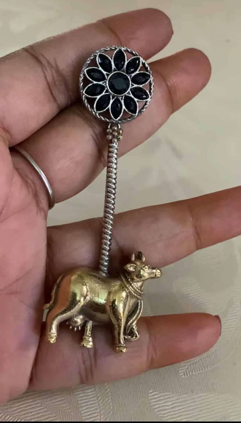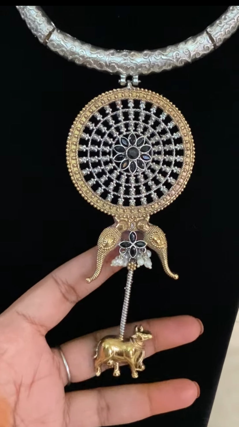 A stunning statement necklace set crafted in an elegant antique dual-tone finish. The beautifully engraved choker-style necklace is highlighted with a grand circular pendant featuring intricate lattice work and traditional Cow motifs, symbolizing strength and prosperity. Delicate hanging pearls add a graceful touch. The set is perfectly paired with matching long drop earrings with charming Cow danglers, making it an ideal choice for festive occasions, weddings, and traditional celebrations.