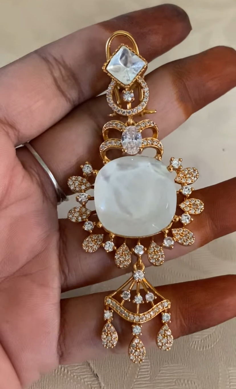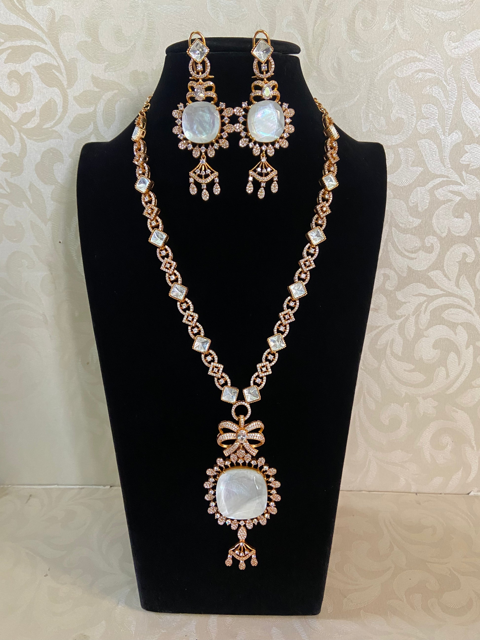 An exquisite handcrafted necklace combining doublet Kundan and shimmering AD stones. Paired with matching earrings, this premium Indian-crafted set adds a royal and statement-making charm for festive and bridal occasions.