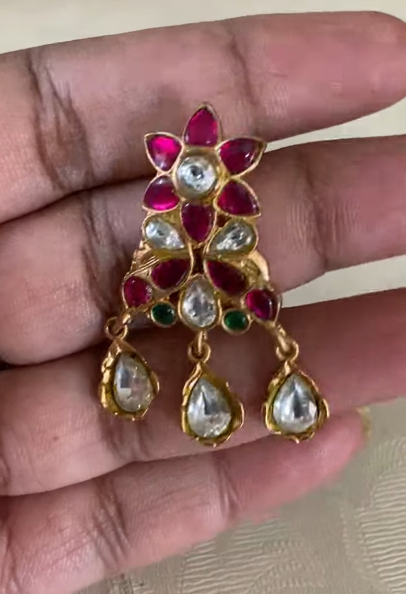 Elegant fusion Jadau pendant necklace with matching earrings, crafted with intricate detailing and a rich blend of traditional artistry and modern design. The exquisite Jadau work and vibrant stones make this set perfect for weddings, festive occasions, and grand celebrations, adding a touch of royal charm to any ensemble.
