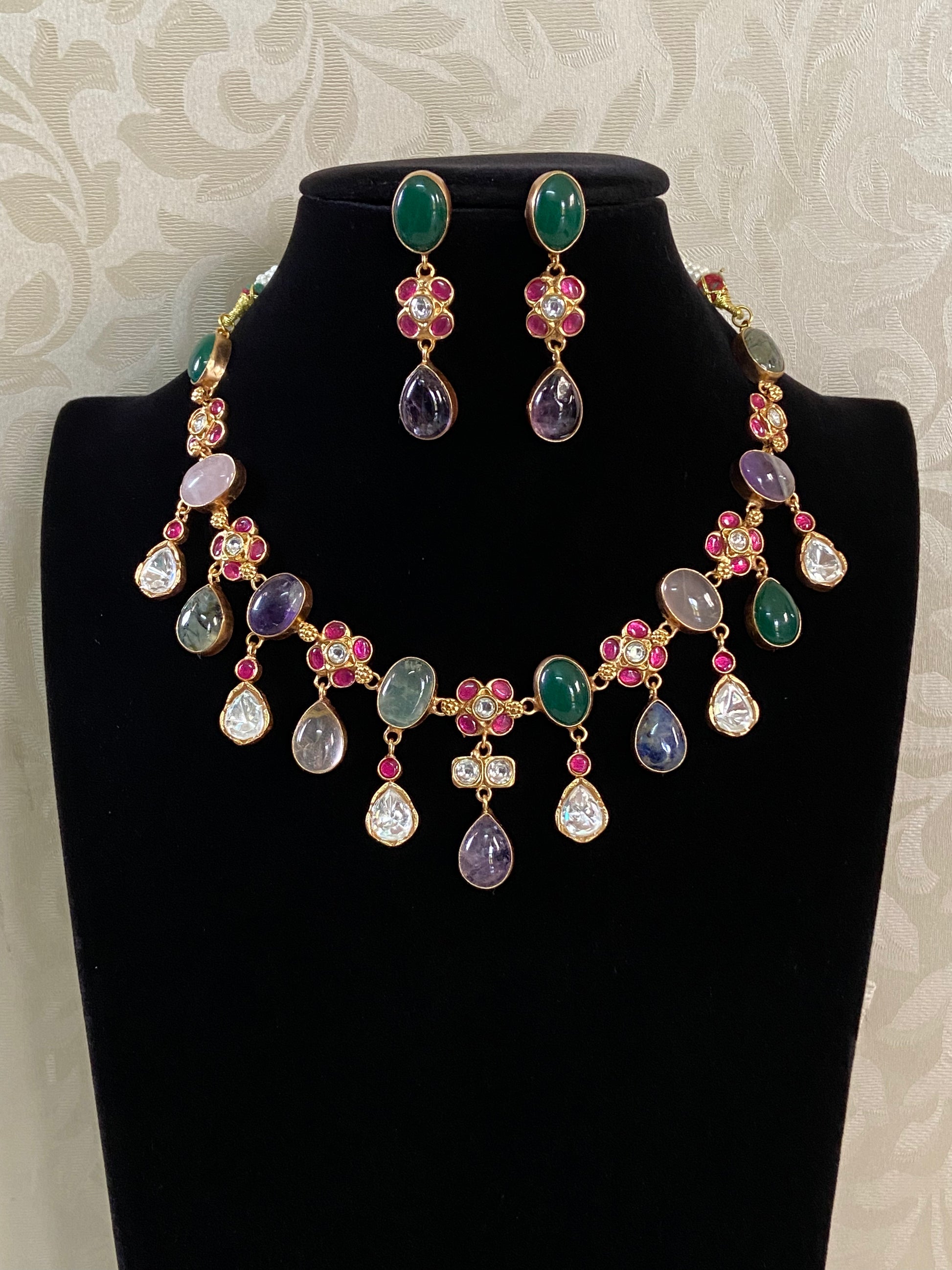 Natural stones Fusion Necklace | Moissanite & Kundan Necklace