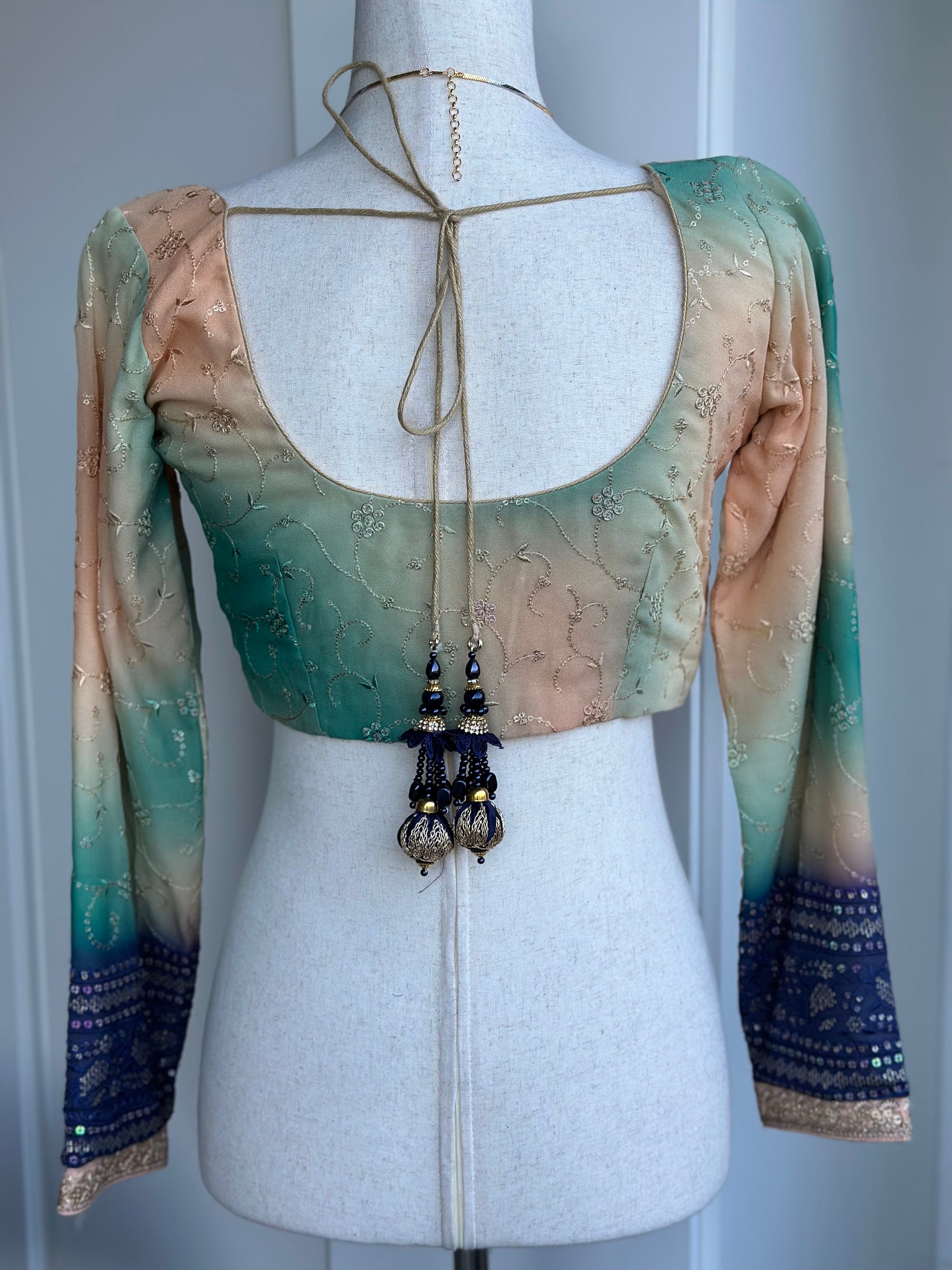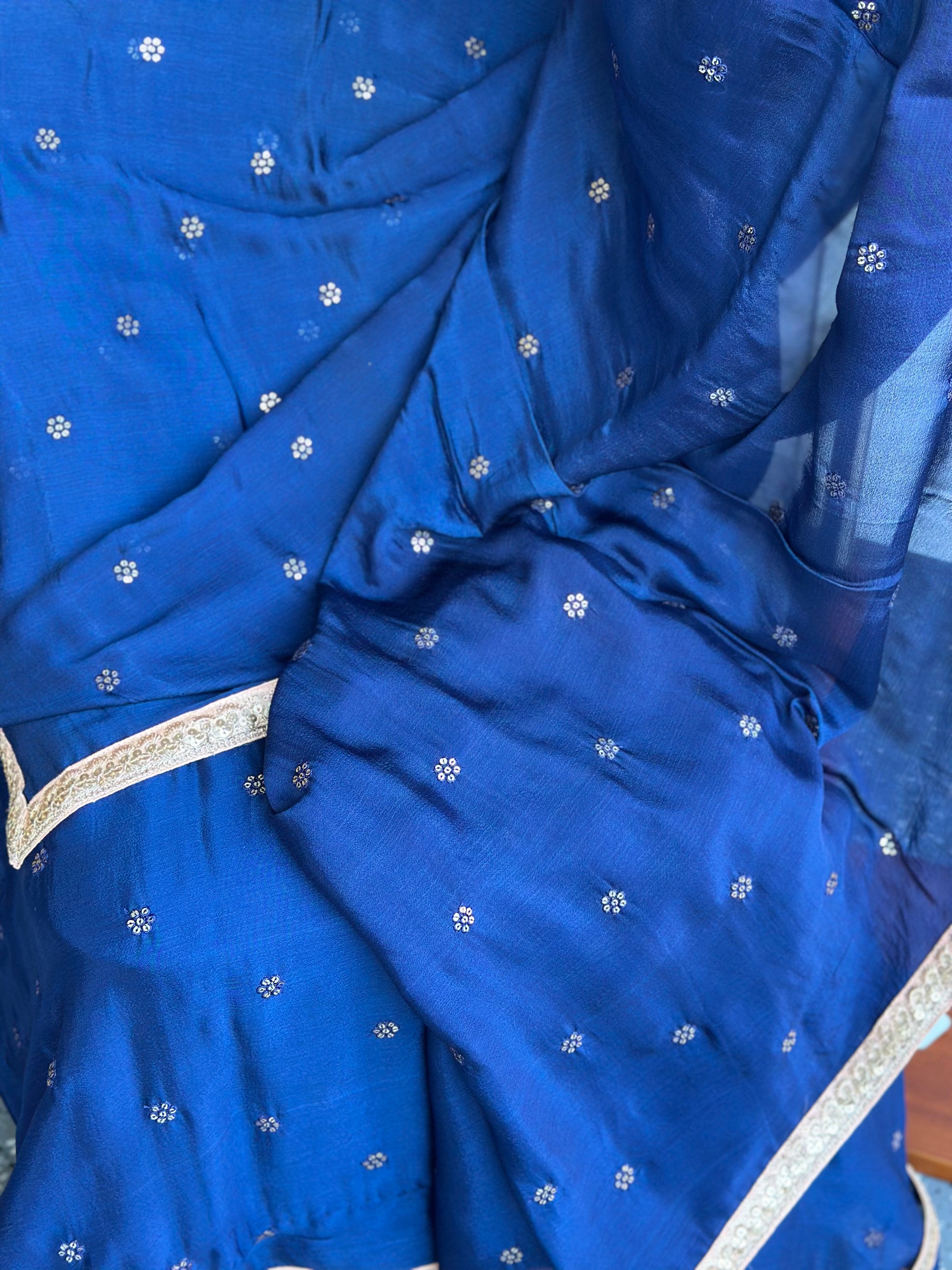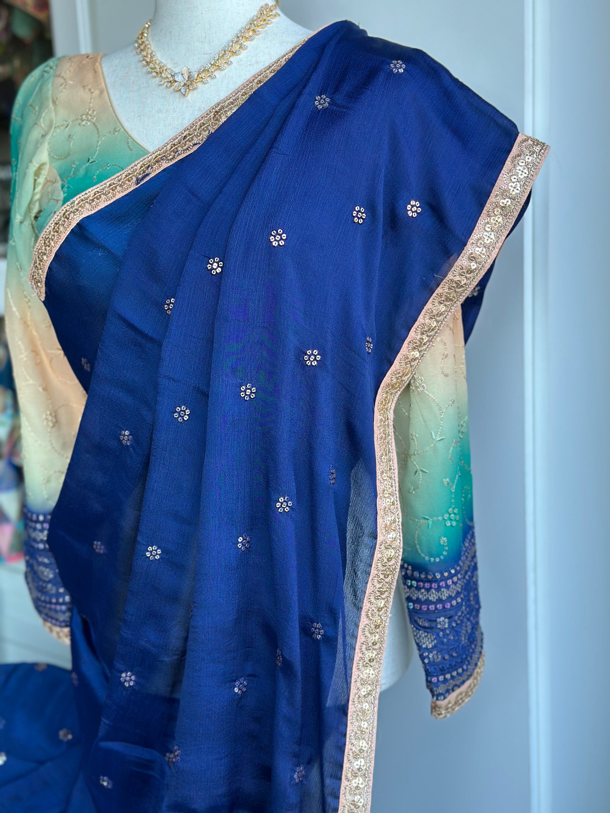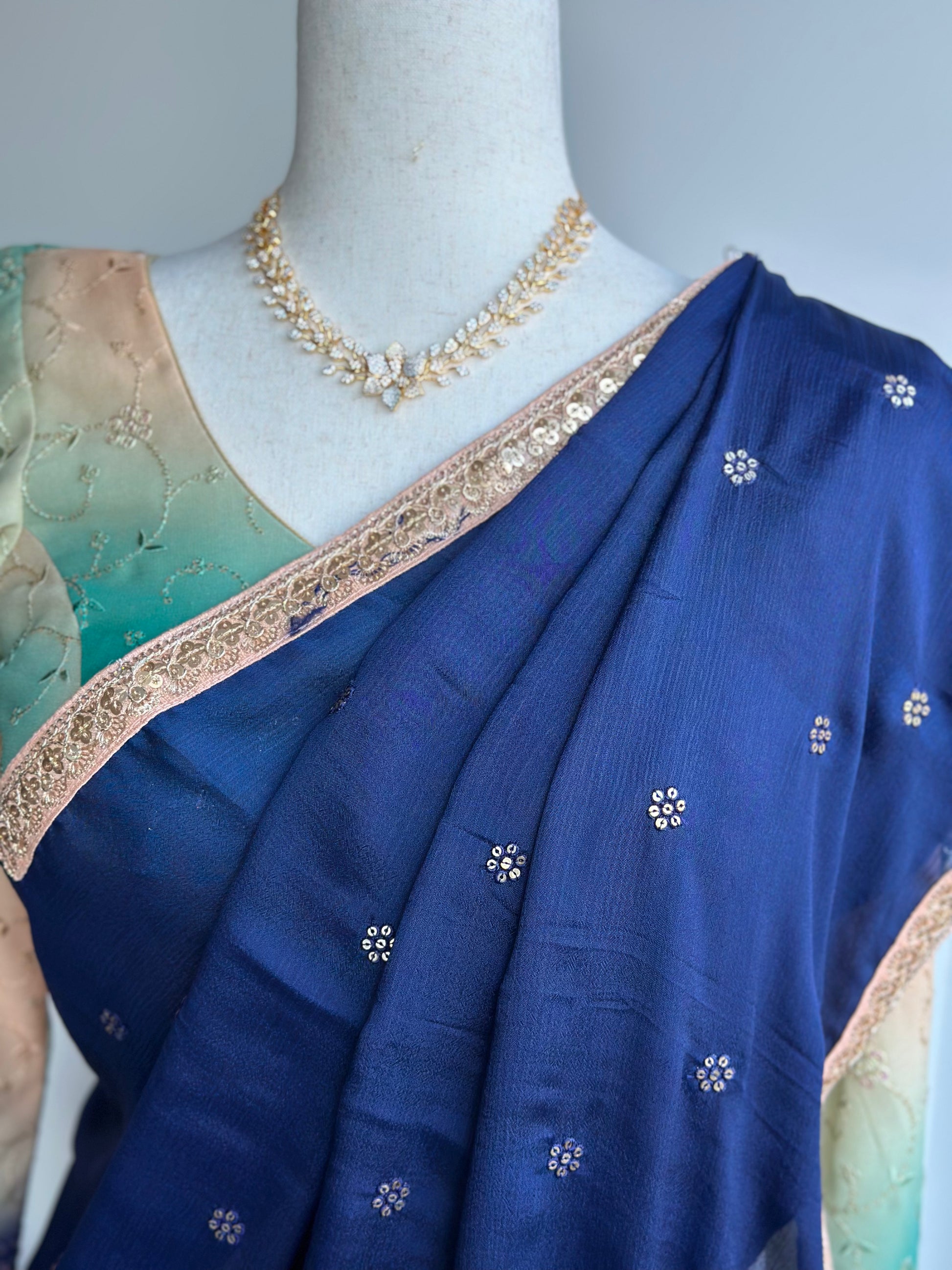 This beautiful Embellished Georgette Saree features delicate stitched sequin floral motifs all over, adding a subtle sparkle to its graceful drape. The saree is adorned with a light golden embroidered lace border, enhancing its refined elegance. It comes paired with a stylish shaded blouse in soft pastel green and peach tones, creating a charming contrast. Perfect for festive occasions, parties, or evening events, this saree radiates classy sophistication and timeless beauty. With pico and fall done, it’s all set for you to wear and shine effortlessly.