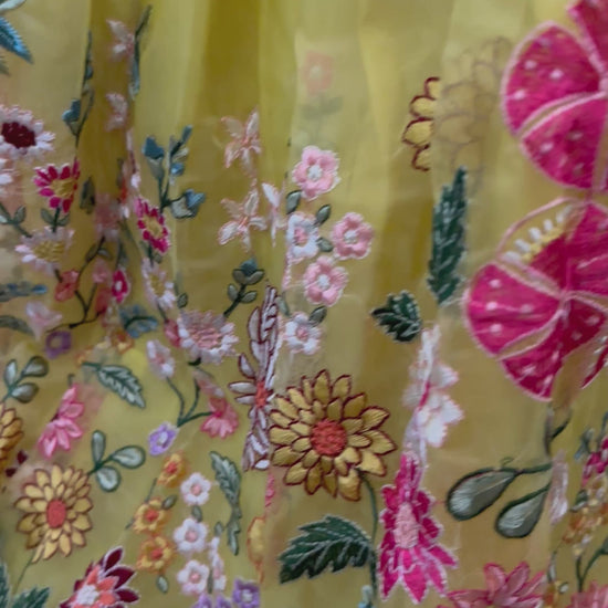 Bright and beautiful yellow top & skirt set for girls, featuring a floral embroidered blouse with puff sleeves and a matching yellow skirt embellished with colorful floral embroidery at the hem. Perfect for festive occasions, birthdays, and celebrations.