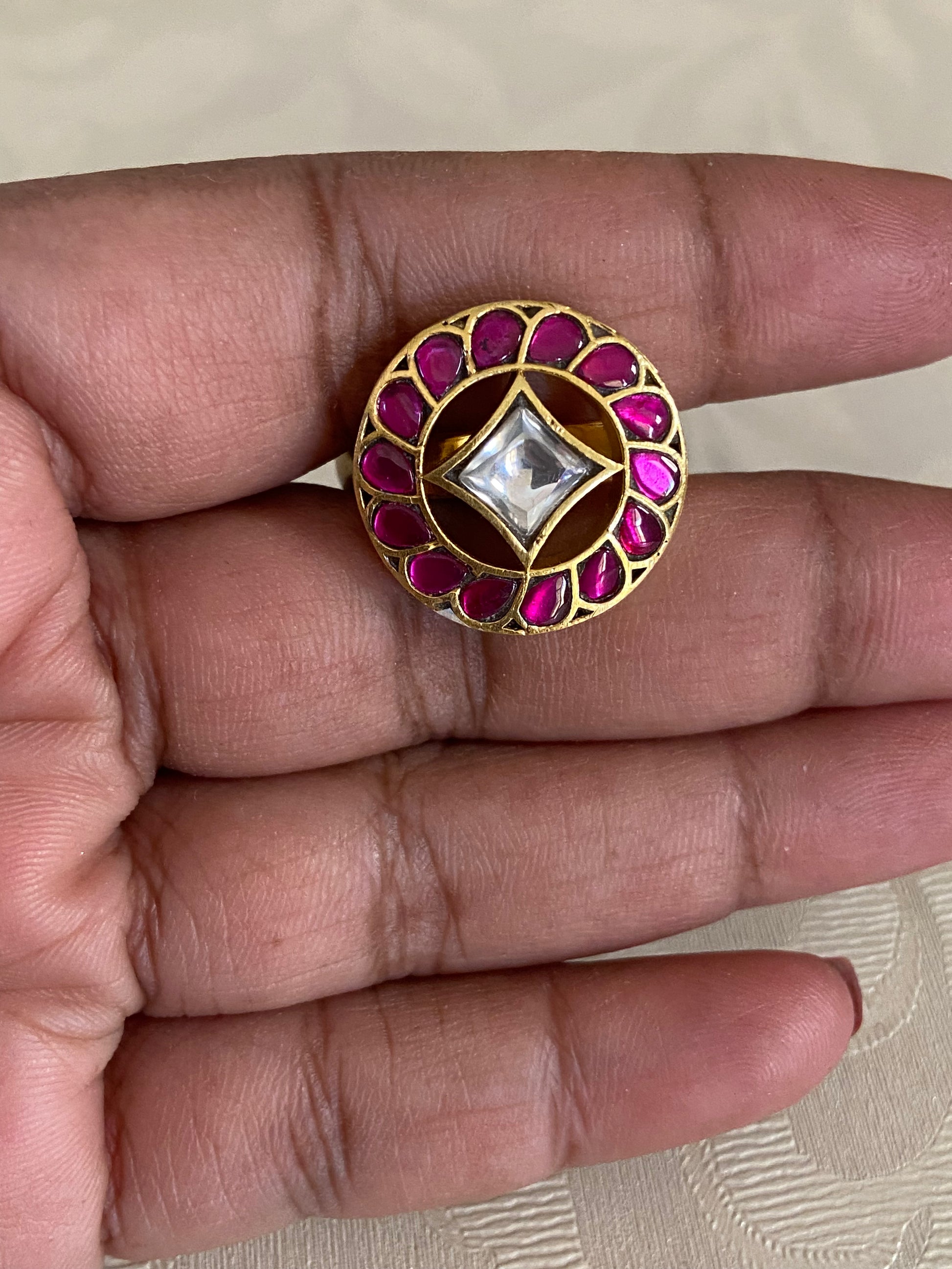 Exquisitely crafted Jadau Kundan Finger Ring featuring intricate detailing and radiant kundan stones. Inspired by royal heritage jewelry, this elegant ring showcases timeless artistry with a luxurious finish. Perfect for weddings, festive occasions, and special celebrations, it adds a regal and graceful touch to traditional and contemporary outfits alike.