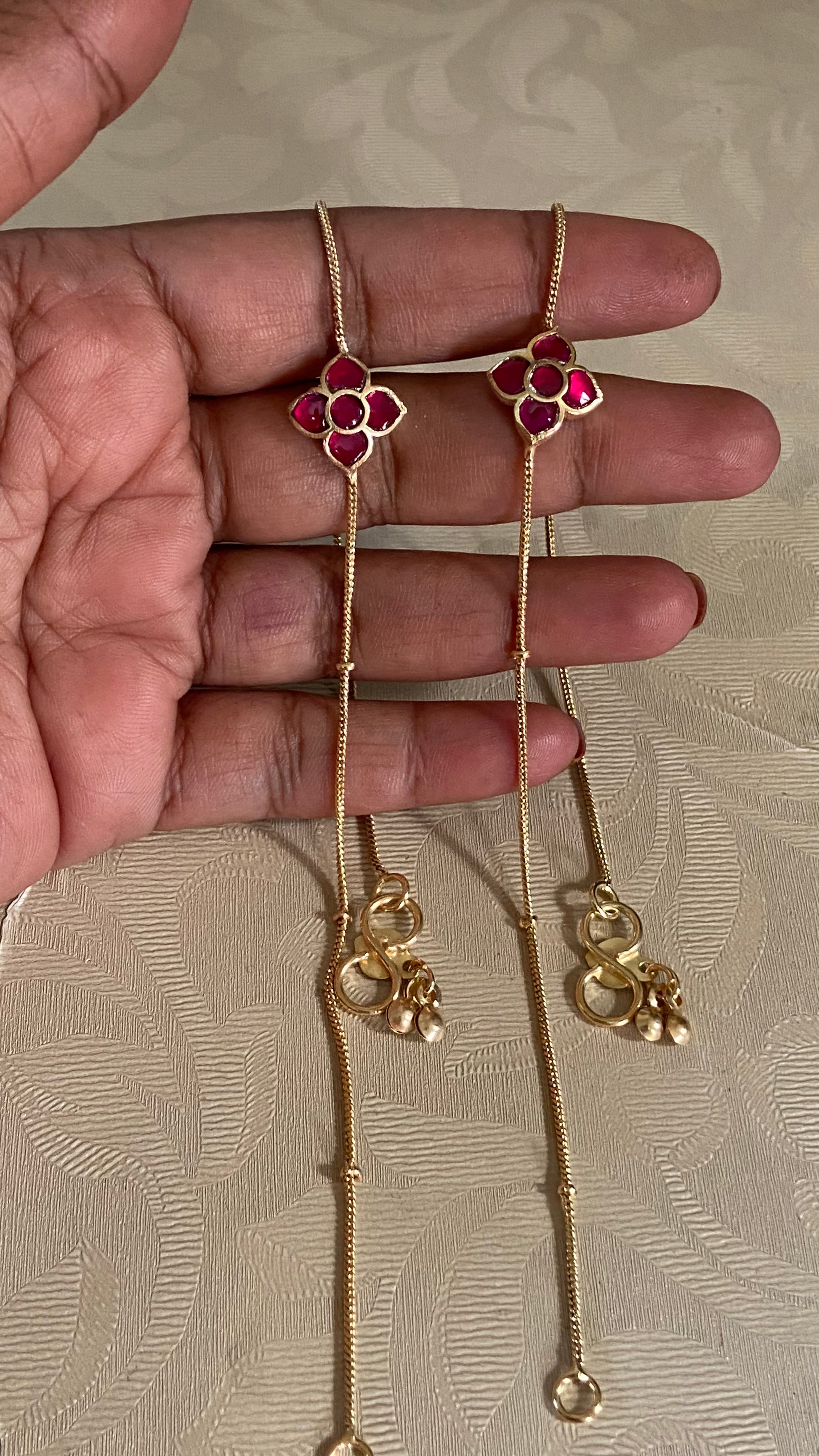 Exquisitely crafted anklets featuring traditional Jadau and Kundan work arranged in graceful floral patterns. These ornate pieces shimmer with embedded stones and intricate metal detailing, adding a touch of elegance and charm to your feet. Perfect for weddings, festive occasions, and traditional outfits — a beautiful blend of heritage craftsmanship and timeless style.
