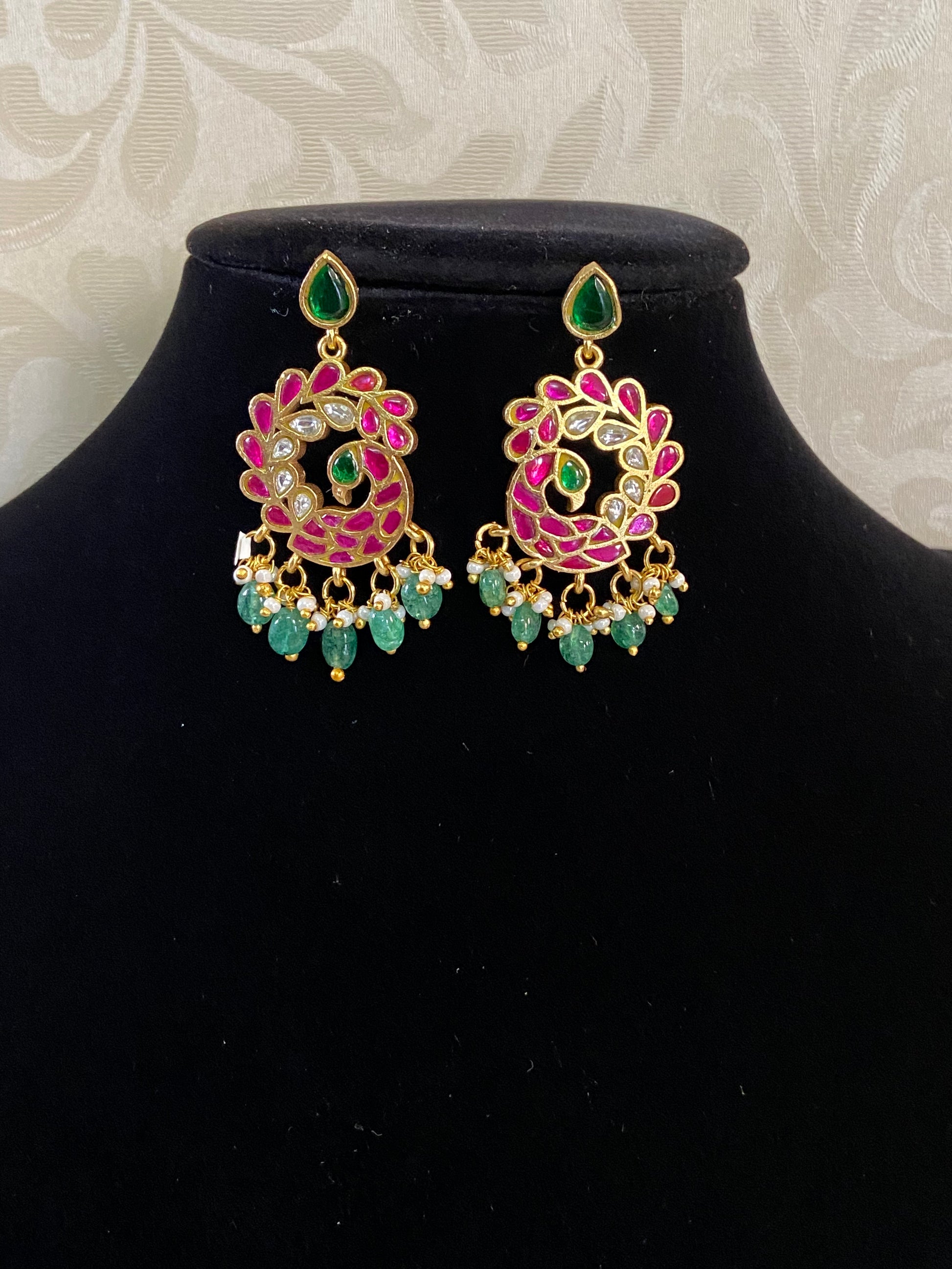Jadau Kundan Peacock Earrings are a stunning blend of traditional artistry and regal elegance, featuring intricate peacock motifs adorned with radiant kundan stones and detailed jadau craftsmanship. The graceful design adds a rich, ethnic charm, making them perfect for weddings and festive occasions while beautifully enhancing bridal and traditional outfits with timeless sophistication.