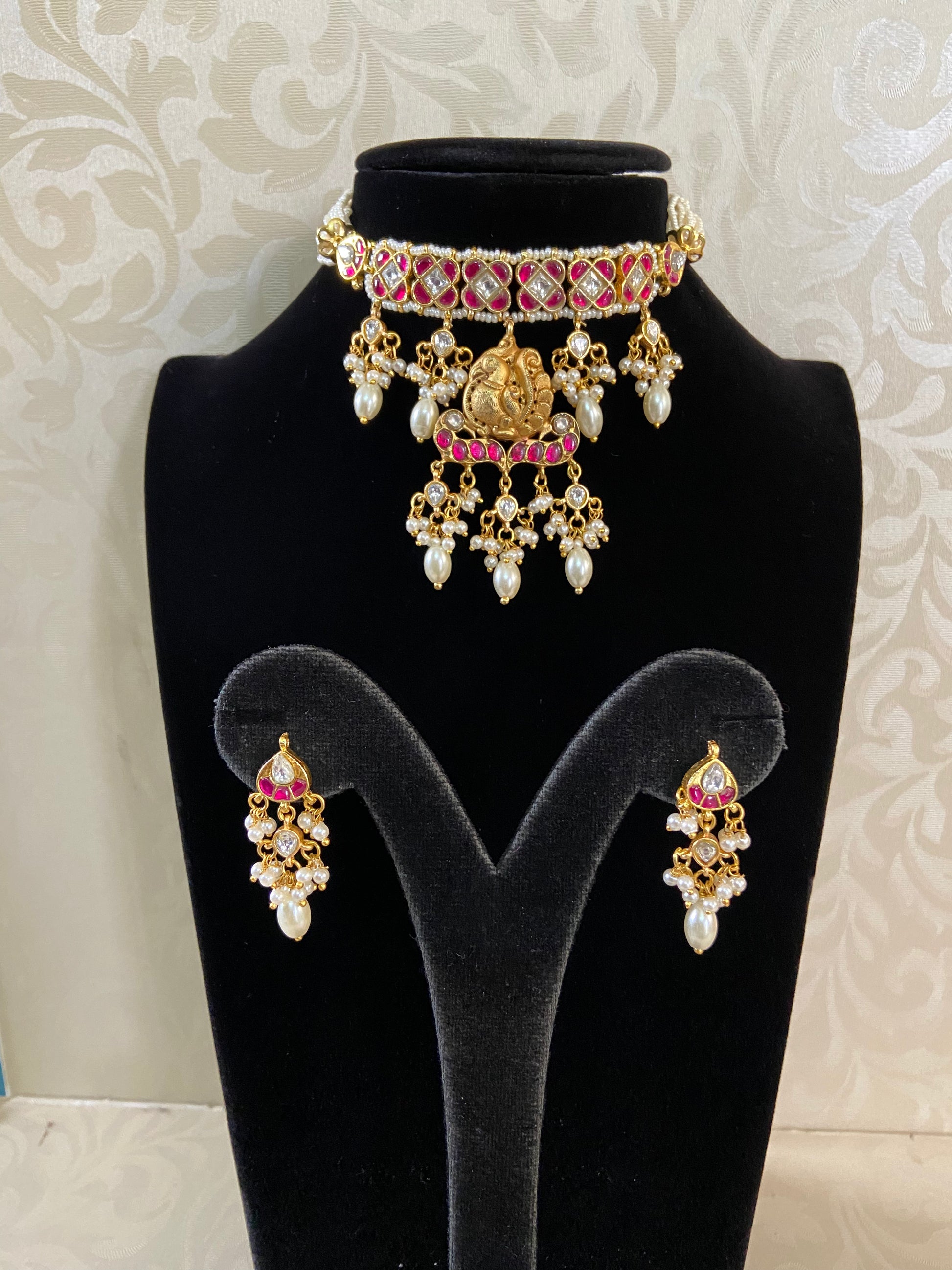 Embrace royal elegance with this Jadau Kundan Pearl Choker Set. Exquisitely handcrafted with intricate jadau kundan work and adorned with lustrous pearls, this choker exudes timeless beauty. Paired with matching earrings, it’s perfect for bridal wear, festive occasions, or any traditional celebration.