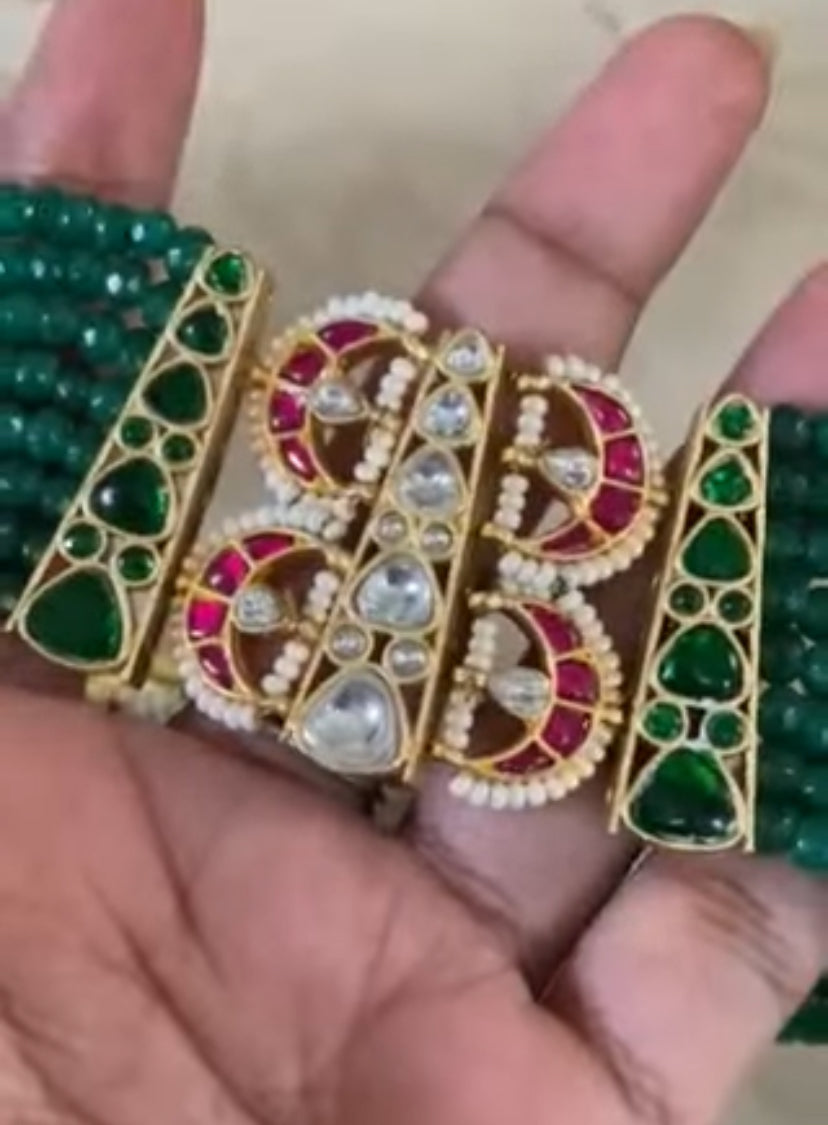 Exude royal charm with this exquisite Jadau Kundan Pendant Beads Choker Set. Beautifully handcrafted with intricate jadau work and radiant kundan detailing, the pendant sits gracefully on a string of elegant beads, creating a perfect fusion of tradition and sophistication. Paired with matching earrings, this choker set is ideal for weddings, festive occasions, and special celebrations — adding a regal touch to your ensemble.