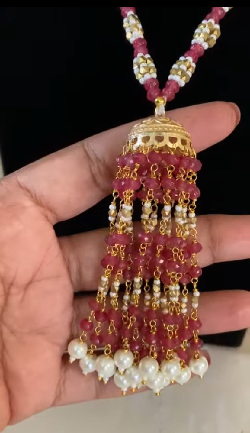 Elegant long beads necklace featuring ruby-tone beads paired with delicate pearl clusters for a graceful traditional look. The highlight is a dome-style jhumka tassel pendant adorned with layered bead chains and pearl drops, creating beautiful movement. Lightweight yet festive, this necklace is perfect for ethnic wear, temple outfits, and special occasions, adding timeless charm and sophistication.
