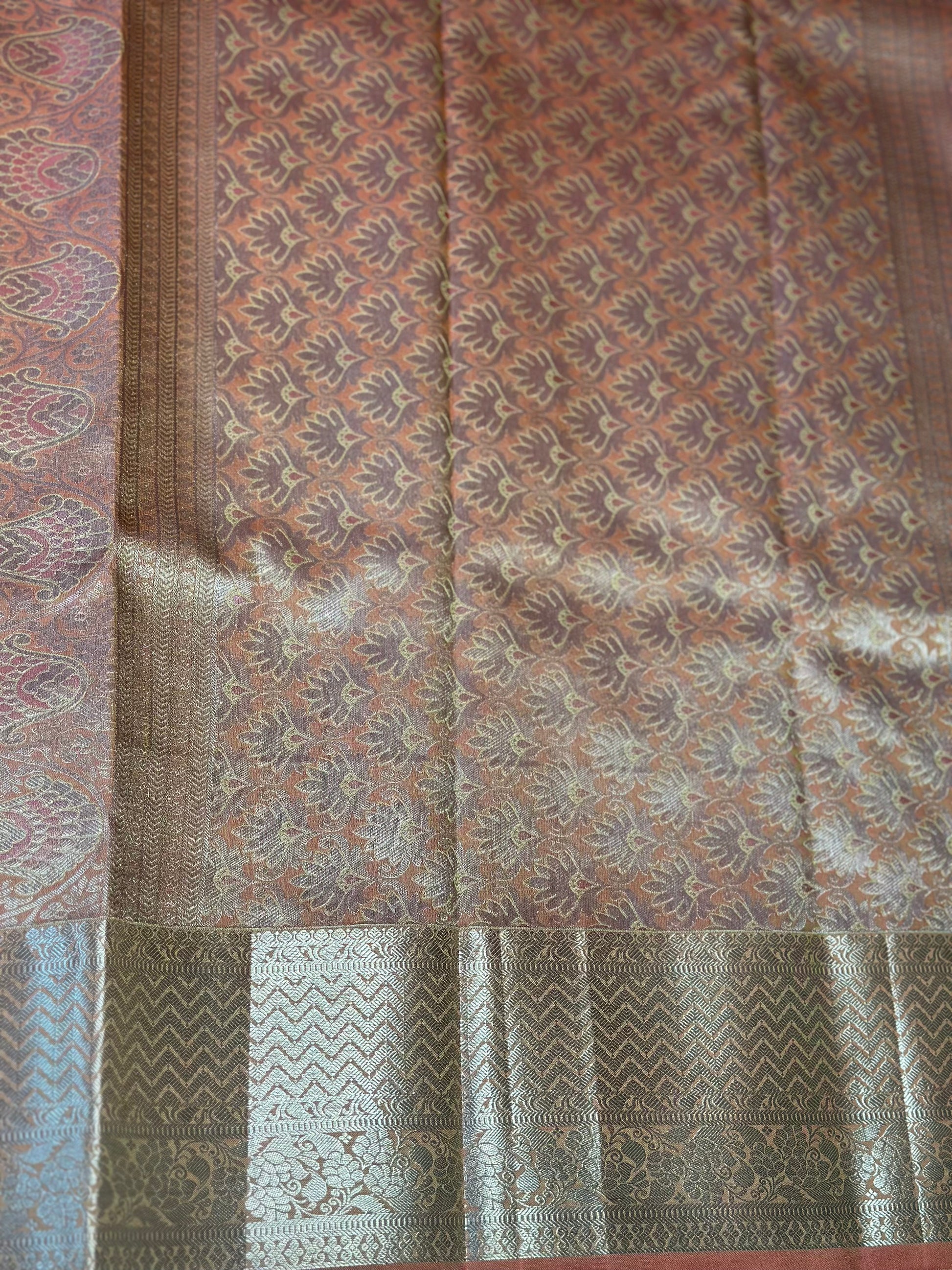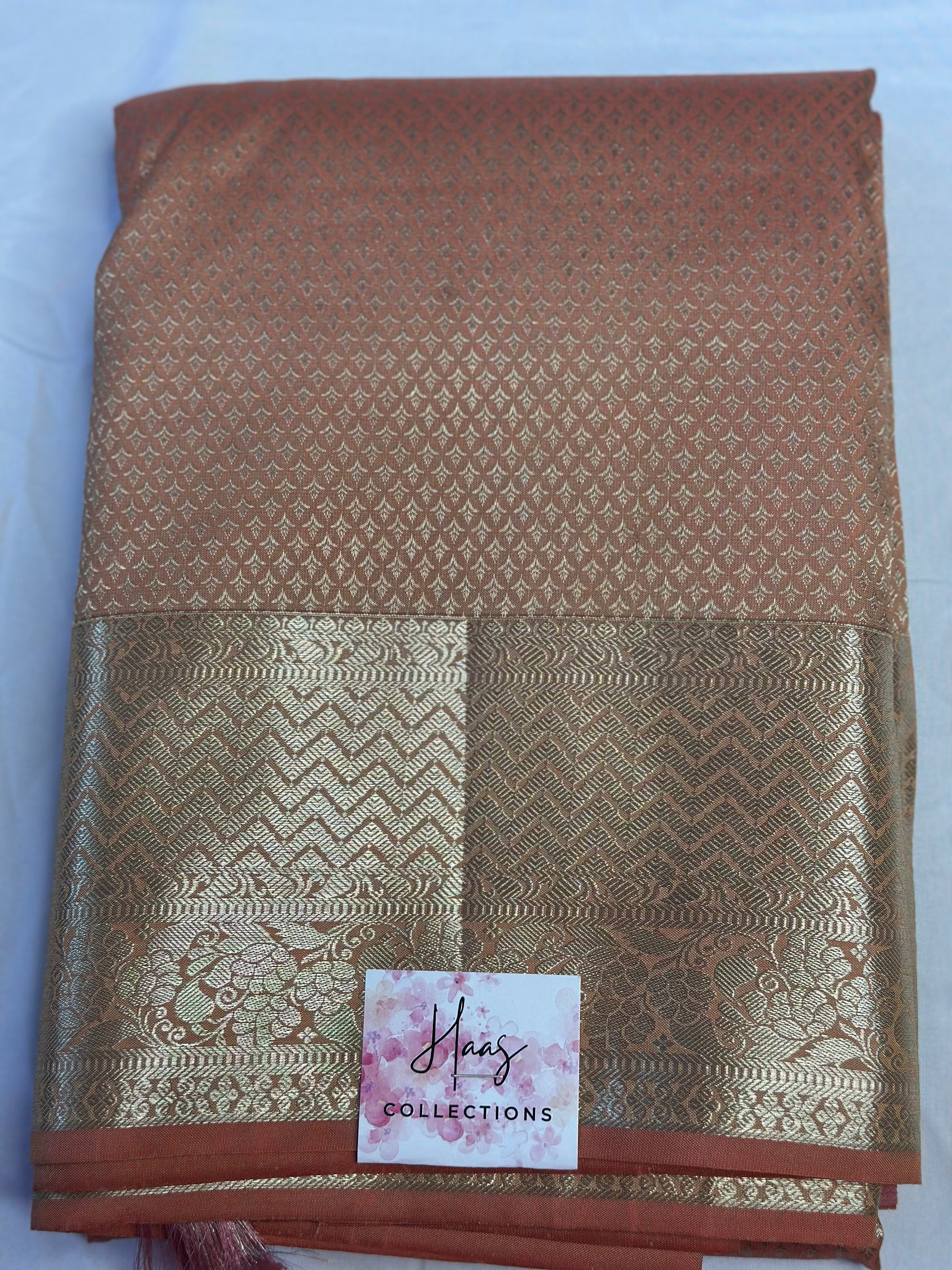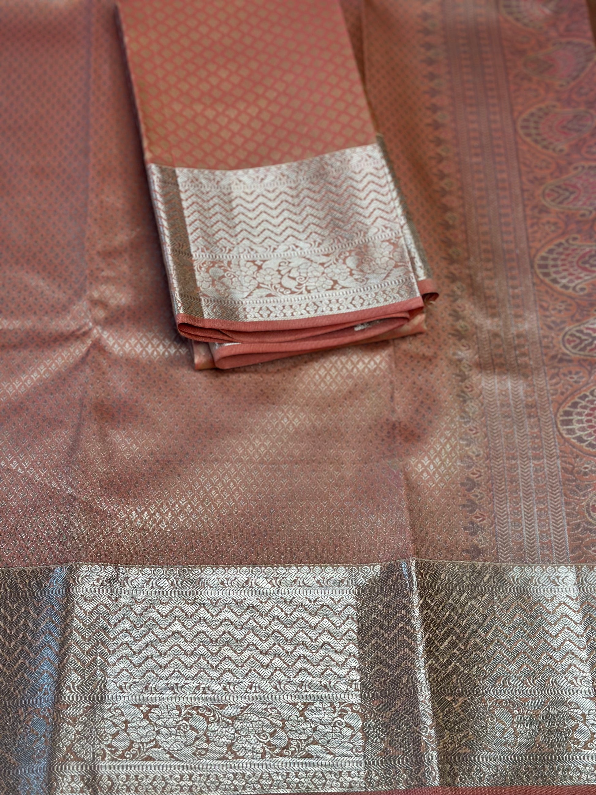 A Kanjivaram pattu saree is a luxurious and traditional South Indian saree, handwoven from premium quality silk in the town of Kanchipuram. Known for its contrasting borders and richly woven pallu, the body and pallu are often woven separately and then skillfully joined, enhancing both durability and elegance. Renowned for their timeless appeal, Kanjivaram sarees are a preferred choice for weddings, festivals, and cultural occasions.Dry wash only.comes with unstitched blouse piece