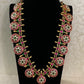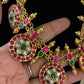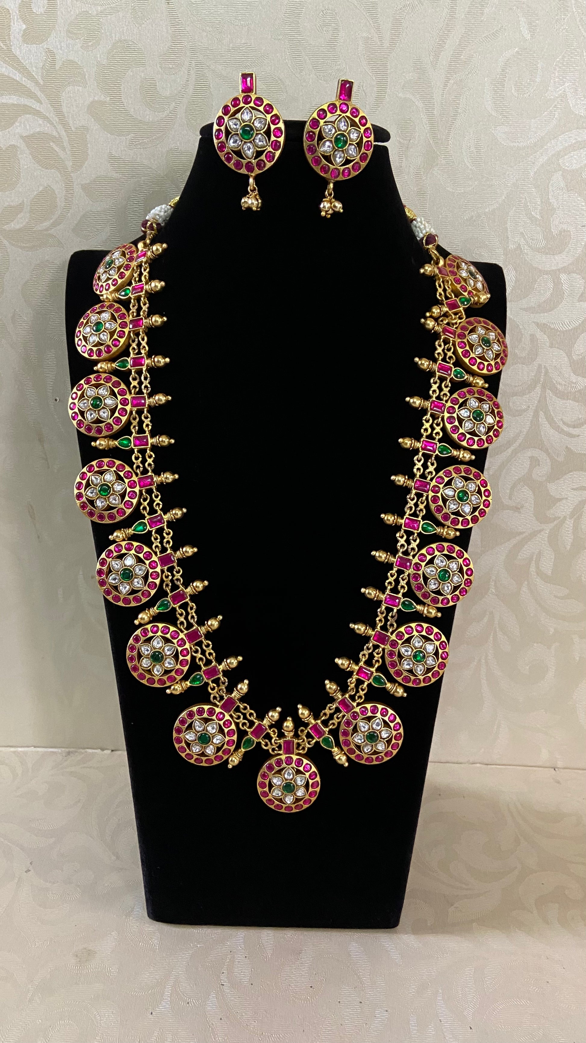 Enhance your bridal and festive look with this Jadau Kundan Bottu Mala Set featuring intricate jadau kundan craftsmanship and traditional bottu motifs. Designed with a regal long-style mala and paired with matching earrings, this set reflects timeless artistry and cultural heritage. The set is multi-purpose – it can be styled as a grand long necklace for weddings or worn as a traditional vaddanam (waist belt) for special occasions, making it a versatile addition to your jewelry collection. .Perfect for weddings, grand celebrations, and special occasions, it adds royal elegance and sophistication to your ethnic ensemble.