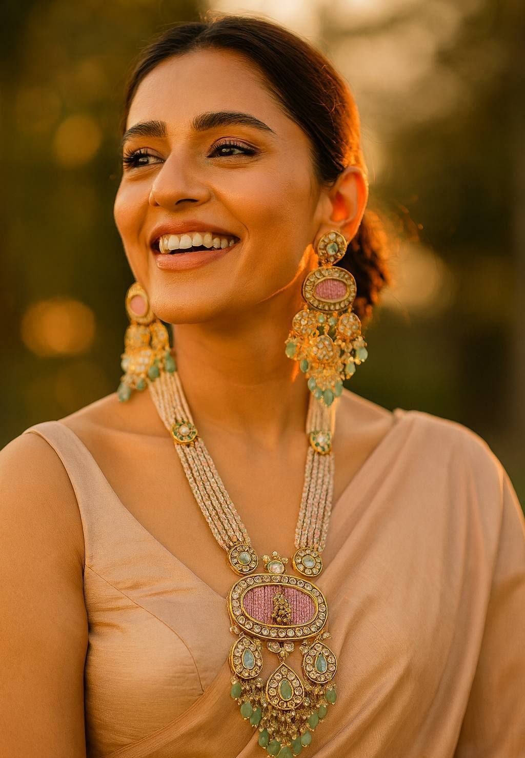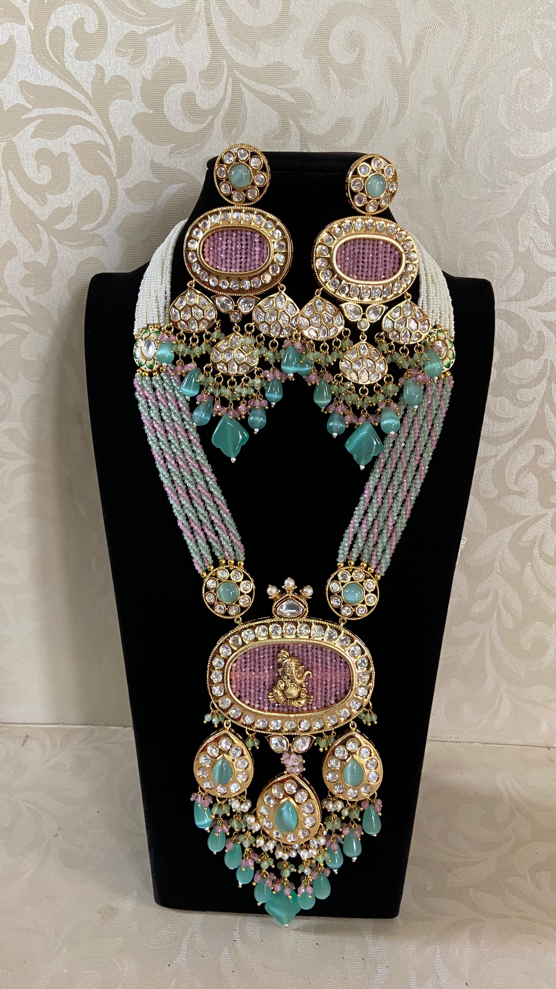 This stunning antique-style necklace features intricate Kundan work with pastel green and pink bead strands, giving it a regal charm. The centerpiece showcases a beautifully crafted temple Ganesh motif, adorned with sparkling polki stones and bordered with pastel accents. Droplets of green and pink beads add an elegant touch of grandeur. Paired with matching statement earrings, this set is perfect for weddings, festive occasions, and traditional celebrations.