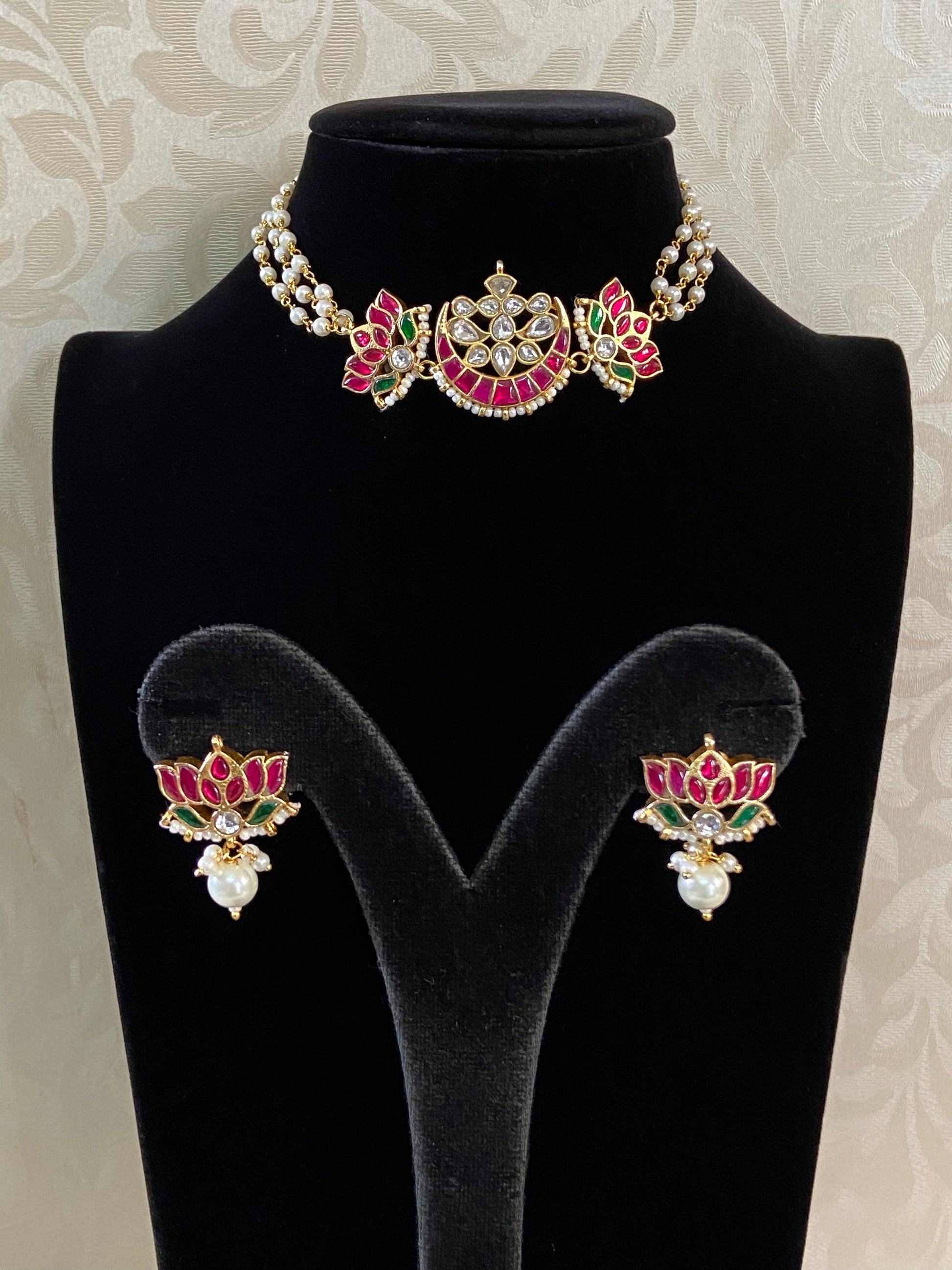 A LotusJadau Kundan Pearl Choker is a luxurious and regal jewelry piece featuring intricately set Kundan stones using the traditional Jadau technique, combined with elegant pearls for a royal touch. This choker sits beautifully around the neck, showcasing fine craftsmanship with a vintage and timeless appeal. Perfect for weddings, festive occasions, and grand celebrations, it adds a touch of grace, opulence, and heritage to any outfit.