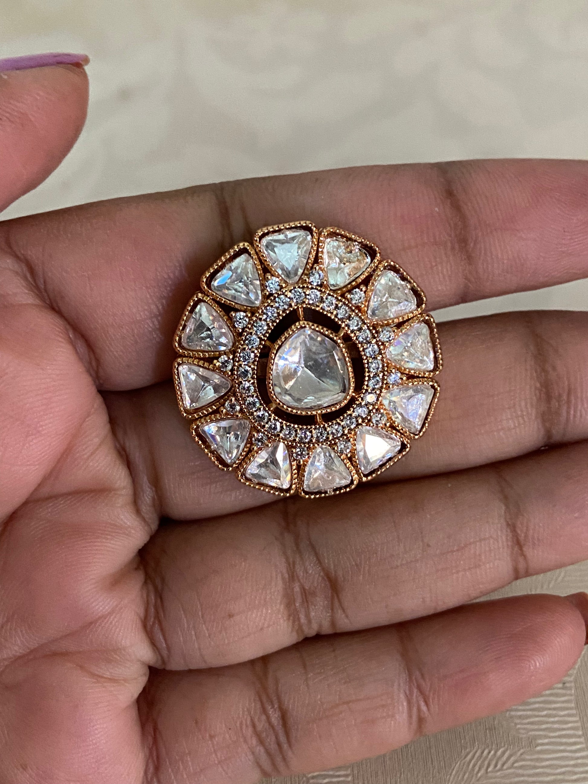 A Moissanite Finger Ring is a dazzling blend of brilliance and tradition. Crafted with shimmering moissanite stones and embellished with classic Kundan work, this ring radiates royal charm with a modern sparkle