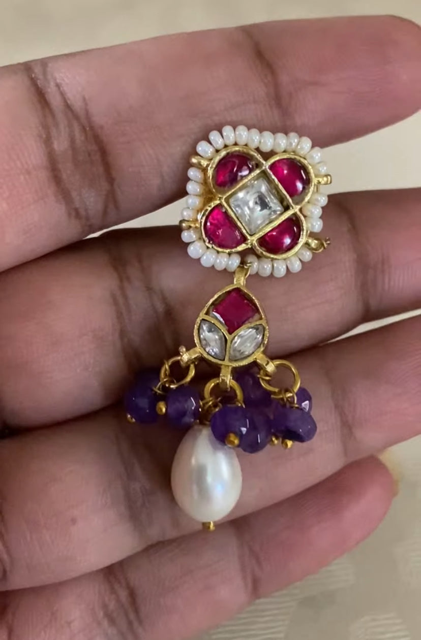Make a regal statement with this elegant Onyx Beads Multi-Layer Necklace Set. Designed with multiple strands of rich Onyx beads, it features exquisite Kundan add a touch of luxury and sparkle. The matching earrings, adorned with pearls and rubies, complete the graceful look.Perfect for festive occasions, weddings, or evening parties — this necklace set beautifully blends royal hues with timeless sophistication.