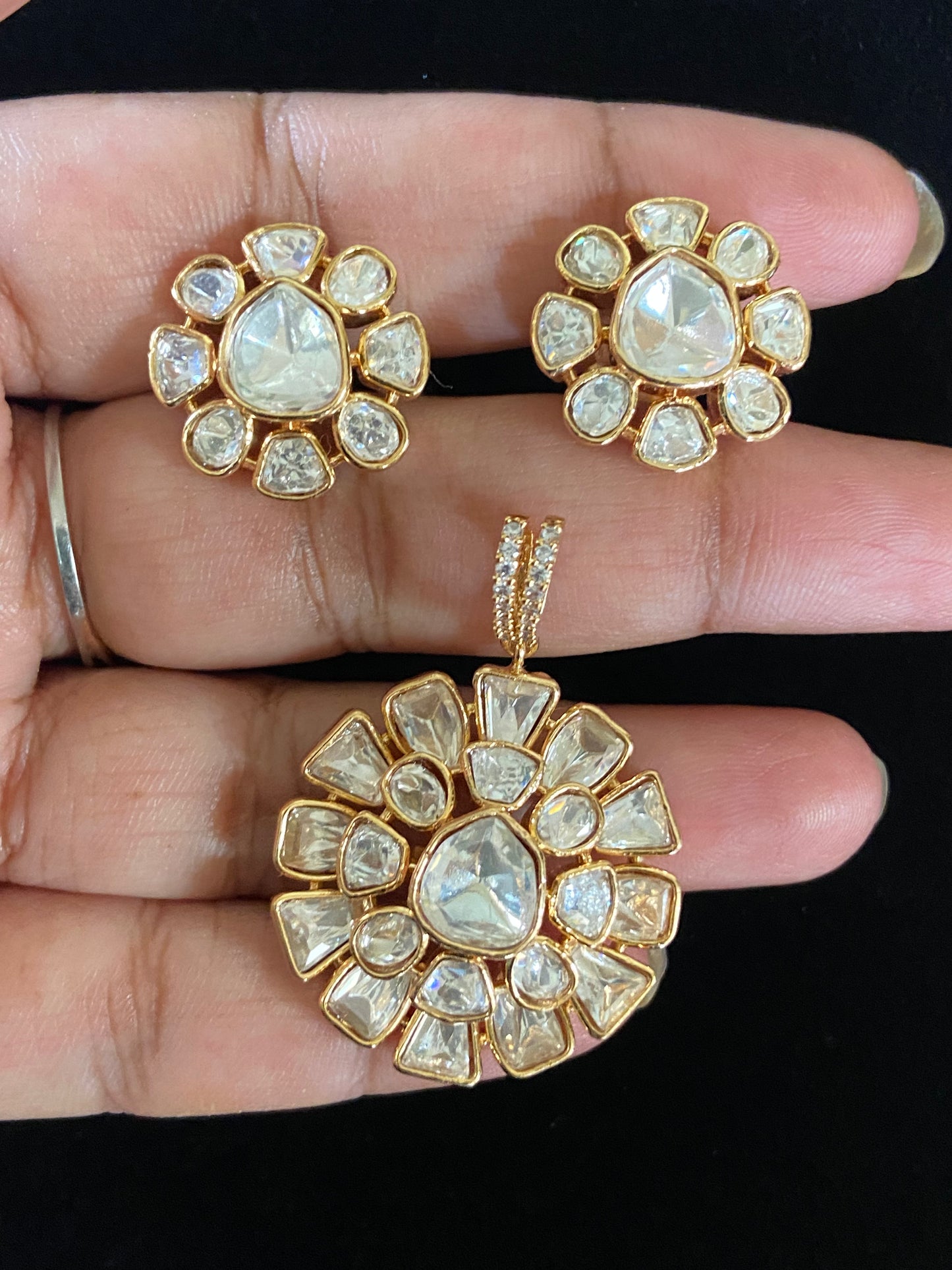 Add a touch of royal charm to your look with this Polki Kundan Pendant & Studs beautifully crafted to showcase timeless elegance. The pendant features intricate Polki Kundan workmanship highlighted with traditional detailing and rich gold tones, exuding a regal vintage appeal.Paired with matching stud earrings, this set perfectly complements both ethnic and festive wear. Ideal for weddings, traditional ceremonies, or special occasions, it adds a graceful sparkle and sophistication to any ensemble.