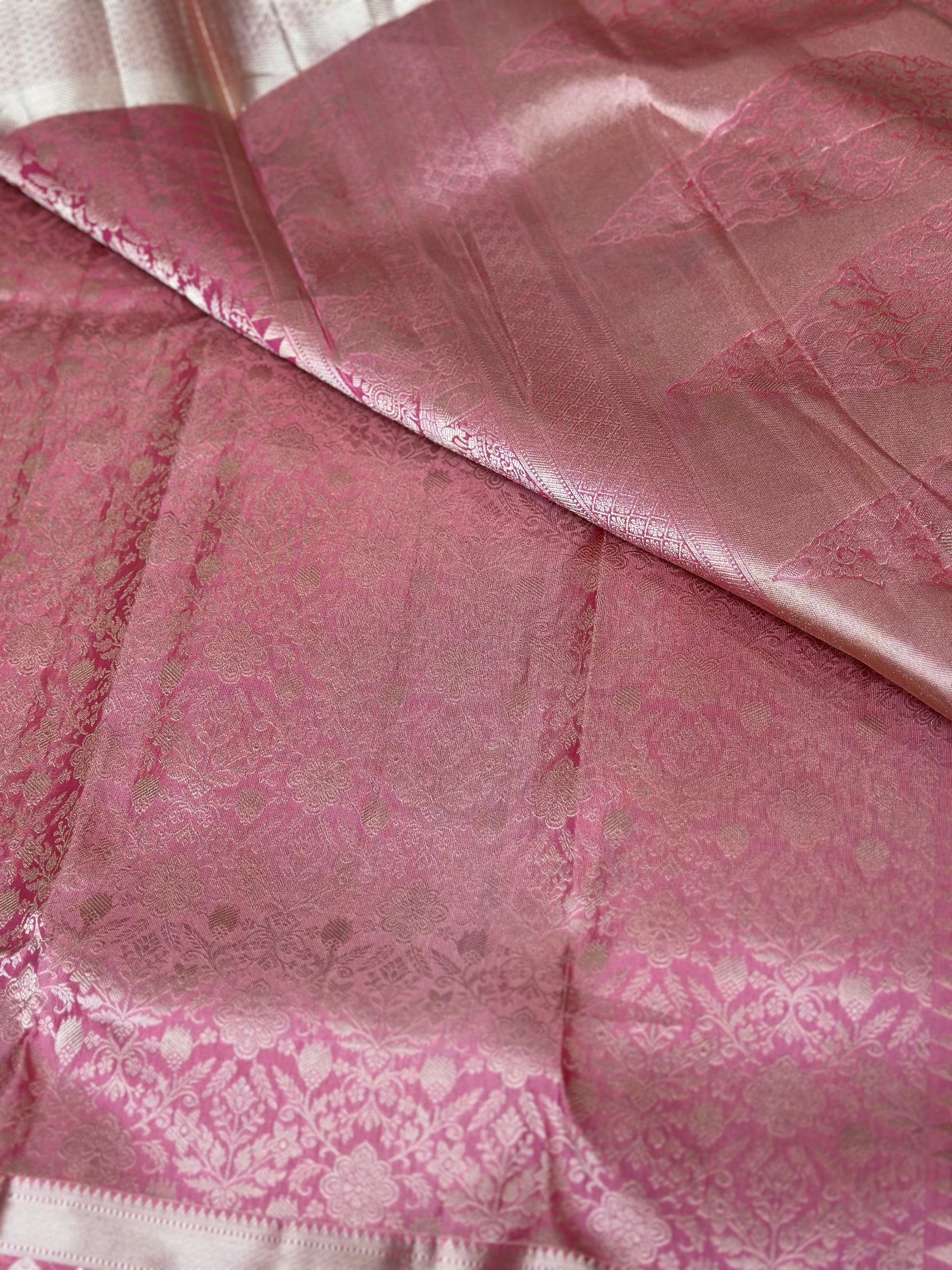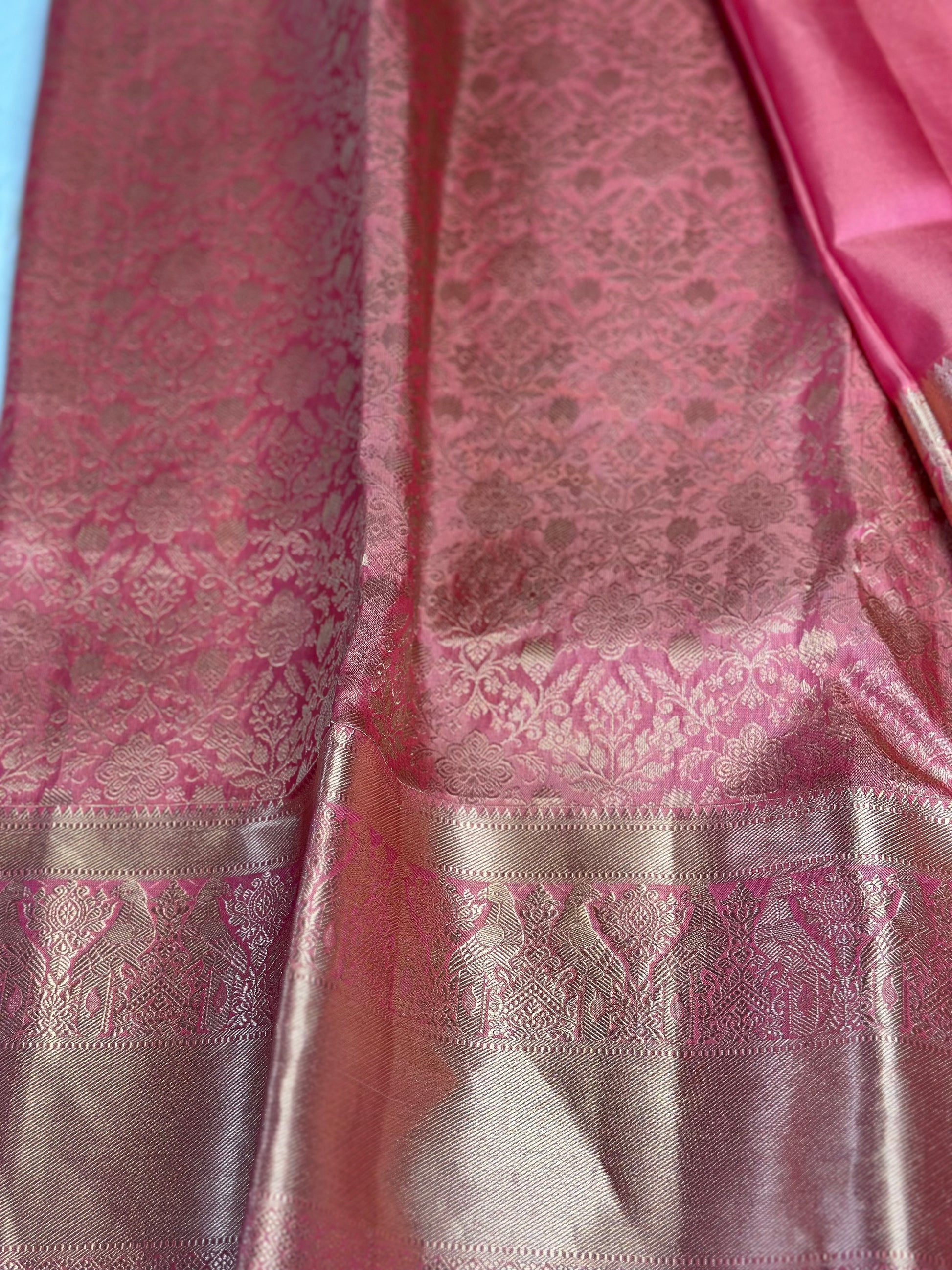 A pure Kanjivaram pattu saree is a luxurious and traditional South Indian saree made from high-quality silk, typically handwoven in the town of Kanchipuram, Tamil Nadu. Known for its vibrant colors, intricate designs, and lustrous texture, the Kanjivaram saree is often adorned with beautiful zari (gold or silver thread) work. The saree's hallmark is its rich, contrasting borders and pallu (the loose end draped over the shoulder) The body and pallu of the saree are usually woven separately and then skillfully joined, adding to the saree's durability and elegance. Kanjivaram sarees are highly regarded for their timeless appeal and are often chosen for weddings, festivals, and significant cultural occasions.The blouse for Saree has not been stitched yet.