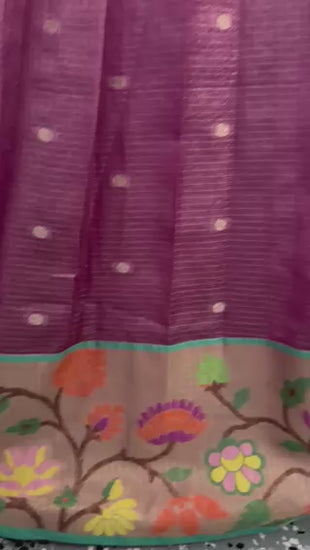 Silk Kota skirt with delicate zari dots all over and a broad border showcasing intricate floral embroidery in multiple colors. A beautiful green Cotton Silk top with mirror embellishments and scalloped edges for a neat, elegant finish.The combination of the rich magenta skirt and green blouse gives a festive and classy traditional look — perfect for occasions like weddings, festivals, or cultural functions.