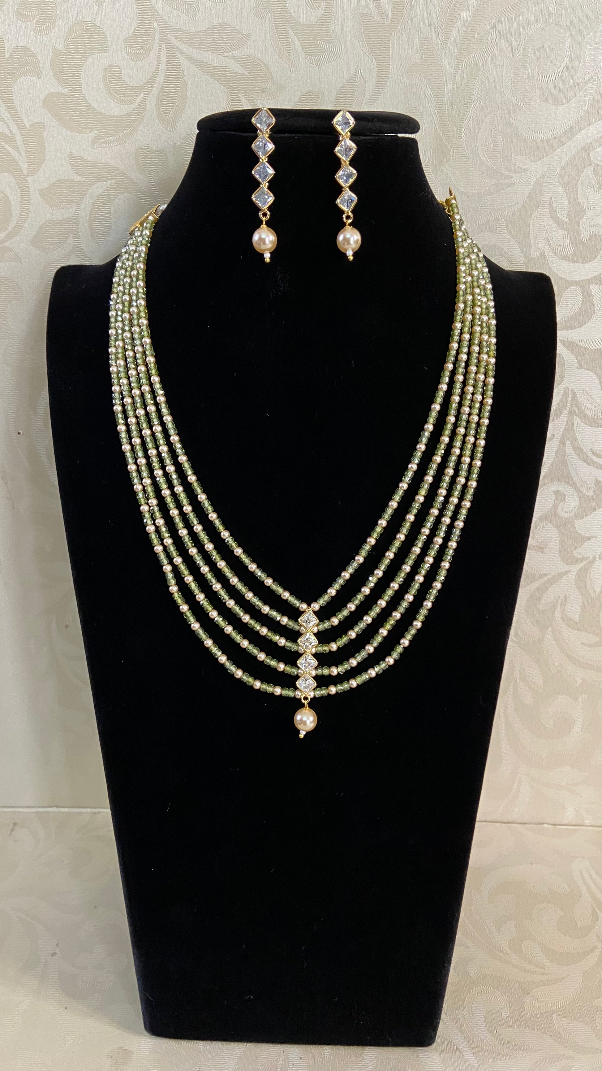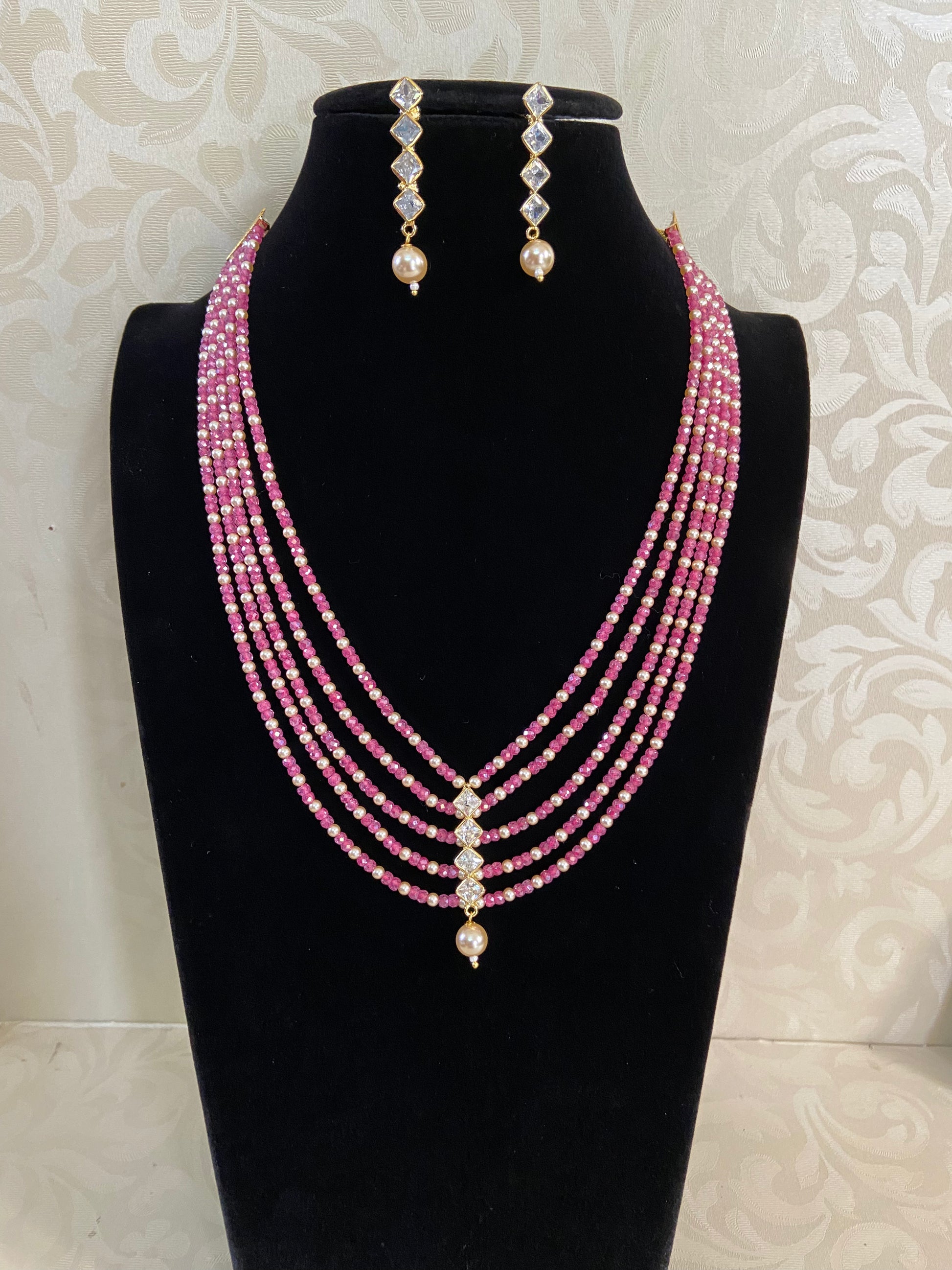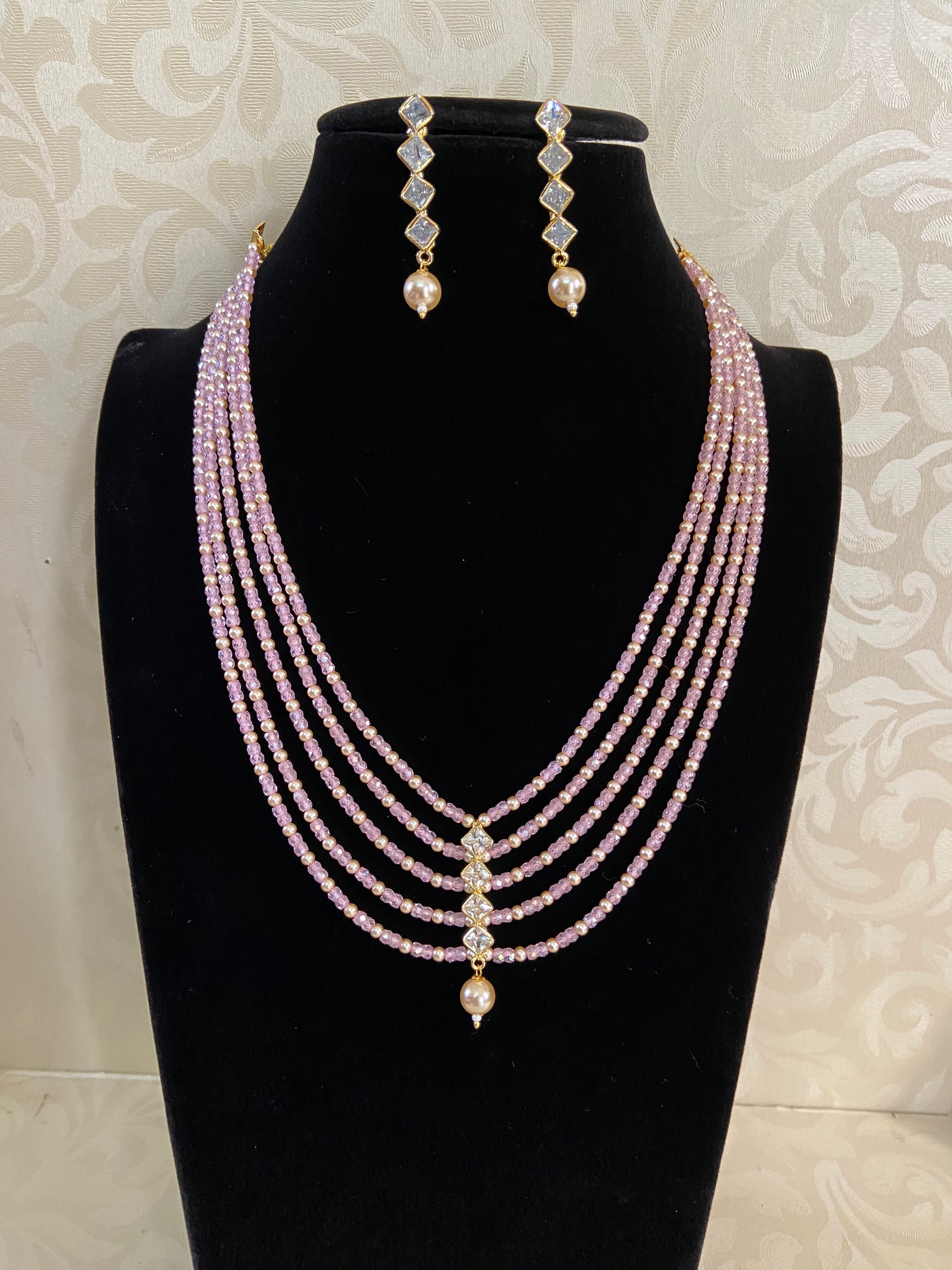 An elegant necklace designed with a charming central pendant and five neatly layered bead lines. Simple yet stylish, this piece adds a graceful touch to both daily wear and festive outfits. Perfect to pair with sarees, kurtis, and ethnic ensembles.