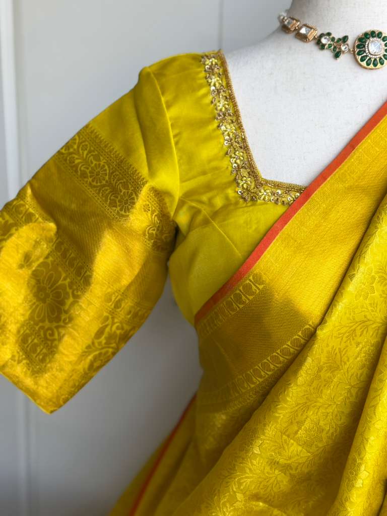 Experience timeless elegance with this Traditional Kanjivaram Pattu Saree, crafted from rich silk that reflects heritage and grace. Designed with intricate woven patterns, it showcases classic South Indian artistry. The saree comes with pico and fall neatly done for a perfect drape. Paired with a beautifully stitched blouse featuring detailed work, it adds a refined touch to your look. Ideal for weddings, festive occasions, and special celebrations, this saree blends tradition with sophistication effortlessly.
