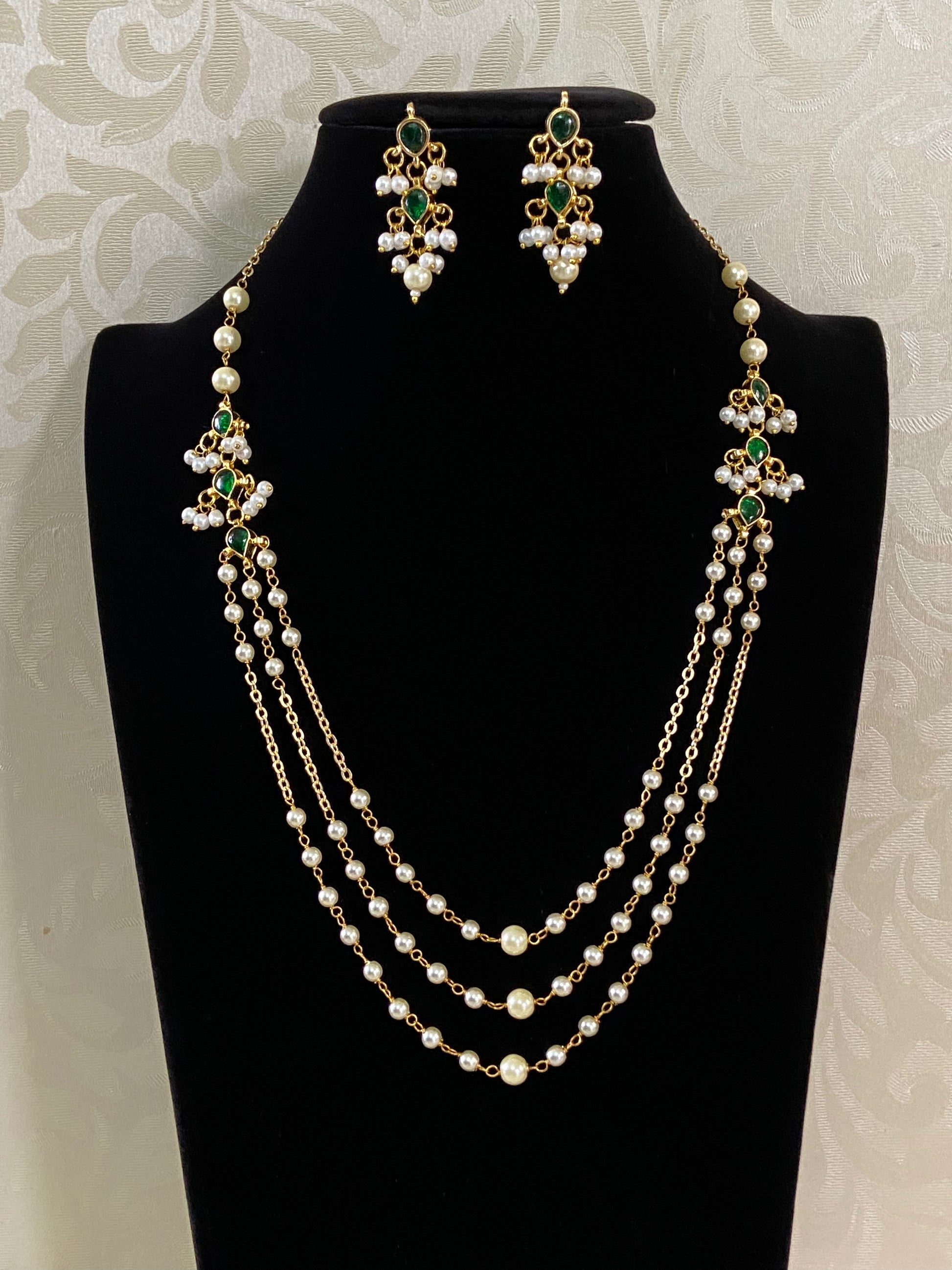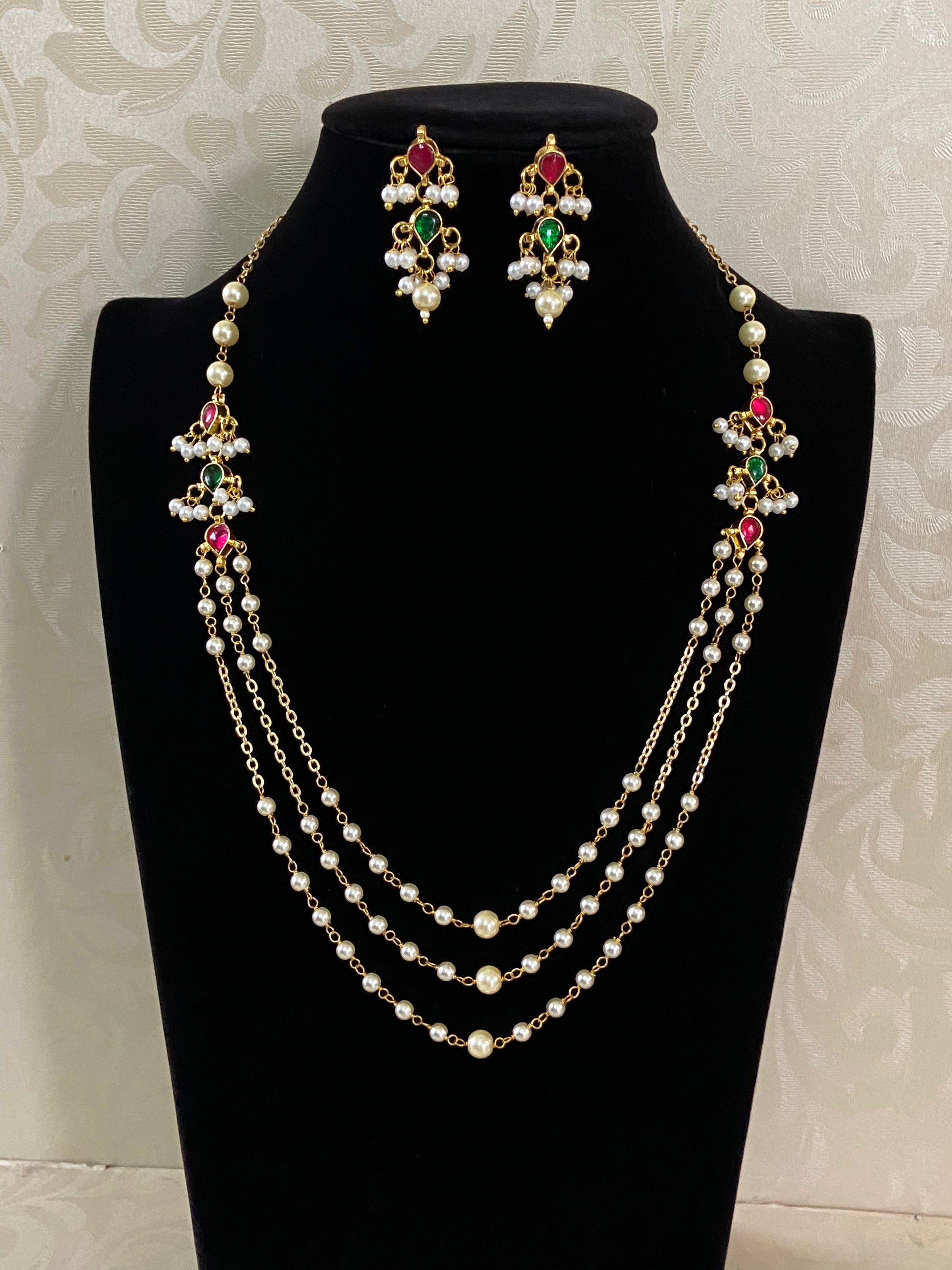 Triple Layer Pearl & Kundan Necklace With Earrings | Indian Necklace